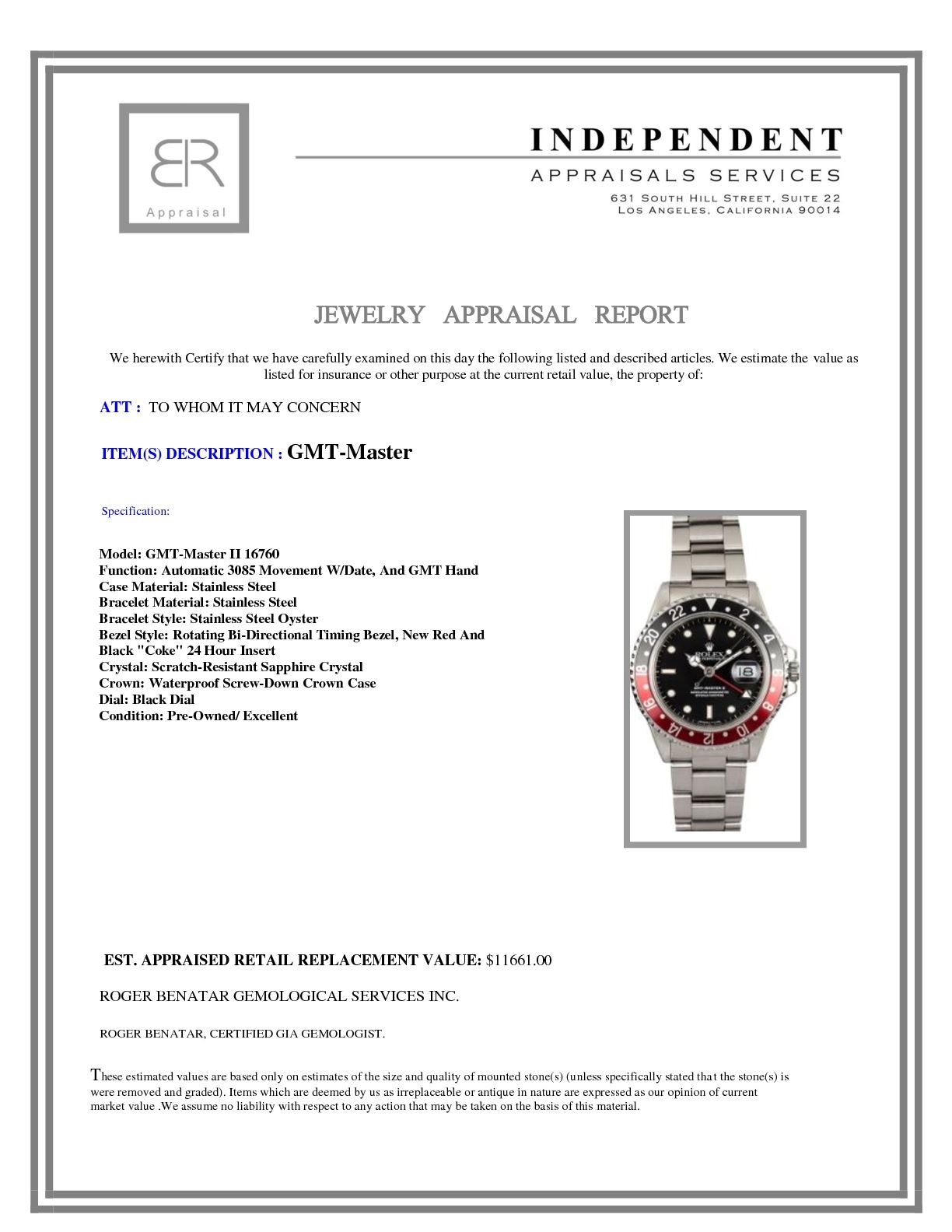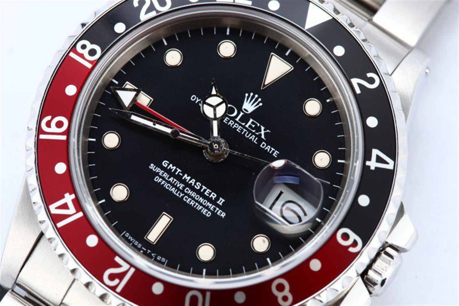 Model/Style-GMT-Master II 16760 Serial/Year-Random Features-Automatic 3085 movement w/ date and GMT hand, scratch resistant sapphire crystal, waterproof screw-down crown, rotating bi-directional timing bezel Case-Stainless steel w/ new red and black "coke" 24 hour insert Bracelet-Stainless steel Oyster #9125