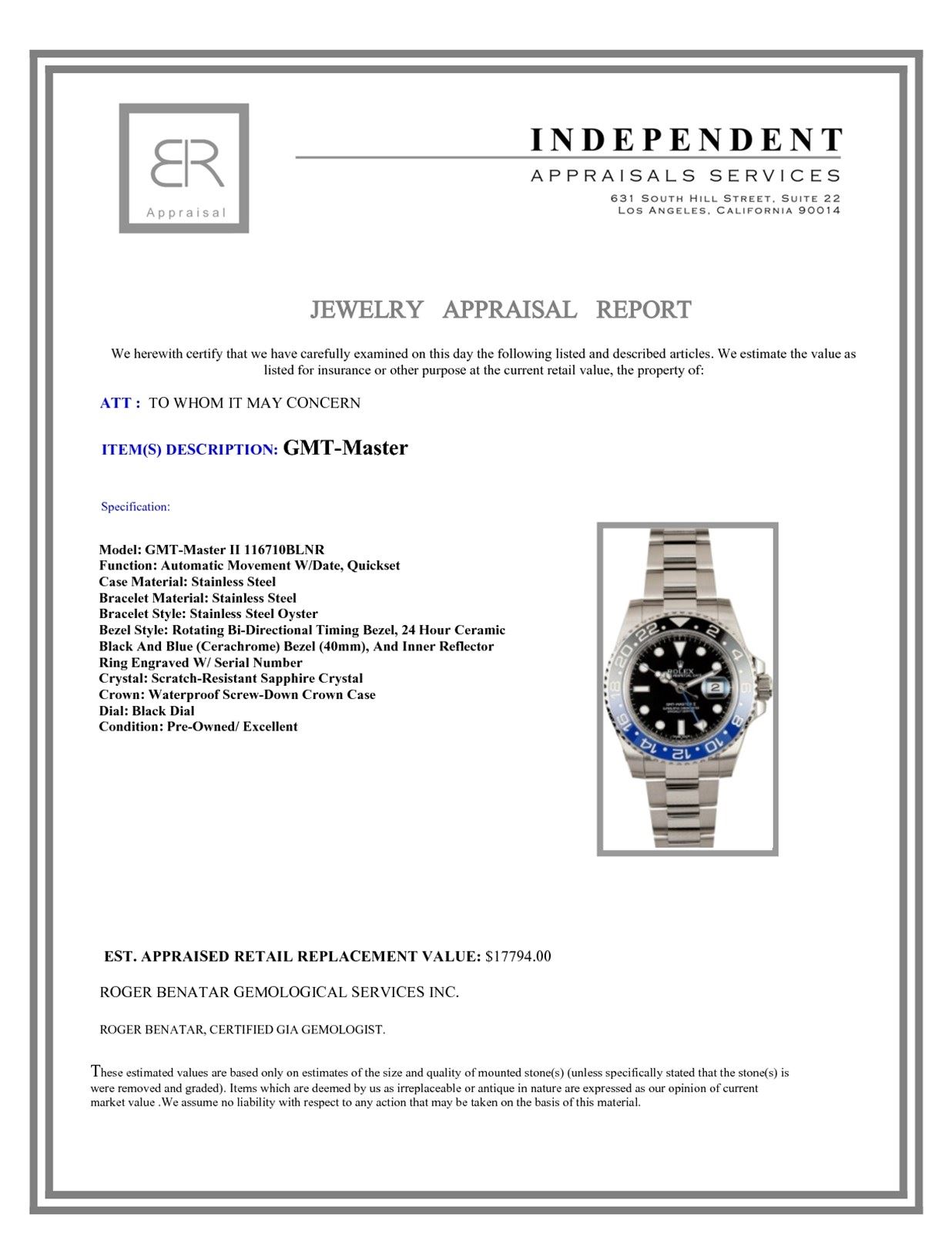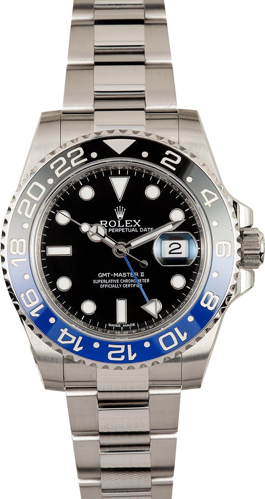 Model/Style-GMT-Master II 116710BLNR Serial/Year-Random Features-Automatic movement w/ date, Quickset, scratch-resistant sapphire crystal, waterproof screw-down crown, rotating bi-directional timing bezel Case-Stainless steel w/ 24 hour ceramic black and blue (Cerachrome) bezel (40mm), inner reflector ring engraved w/ serial number Bracelet-Stainless steel Oyster #9097