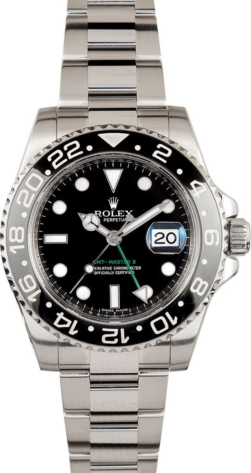 Model/Style-GMT-Master II 116710BKSO Serial/Year-Random Features-Automatic movement w/ date, Quickset, scratch-resistant sapphire crystal, waterproof screw-down crown, rotating bi-directional timing bezel Case-Stainless steel w/ 24 hour ceramic (Cerachrome) bezel (40mm), inner reflector ring engraved w/ serial number Bracelet-Stainless steel Oyster #9096