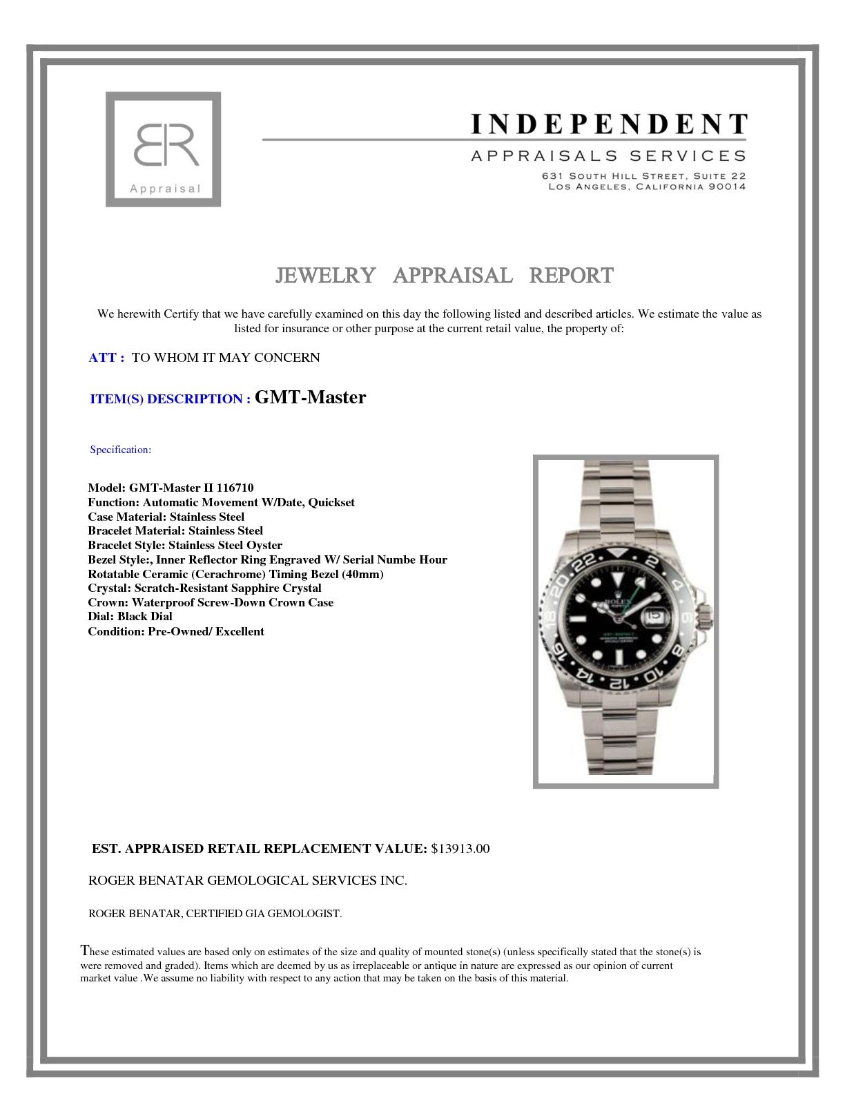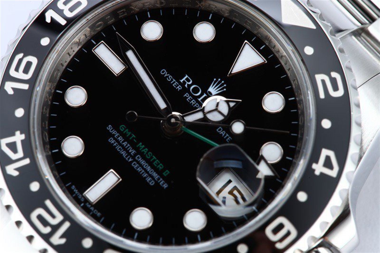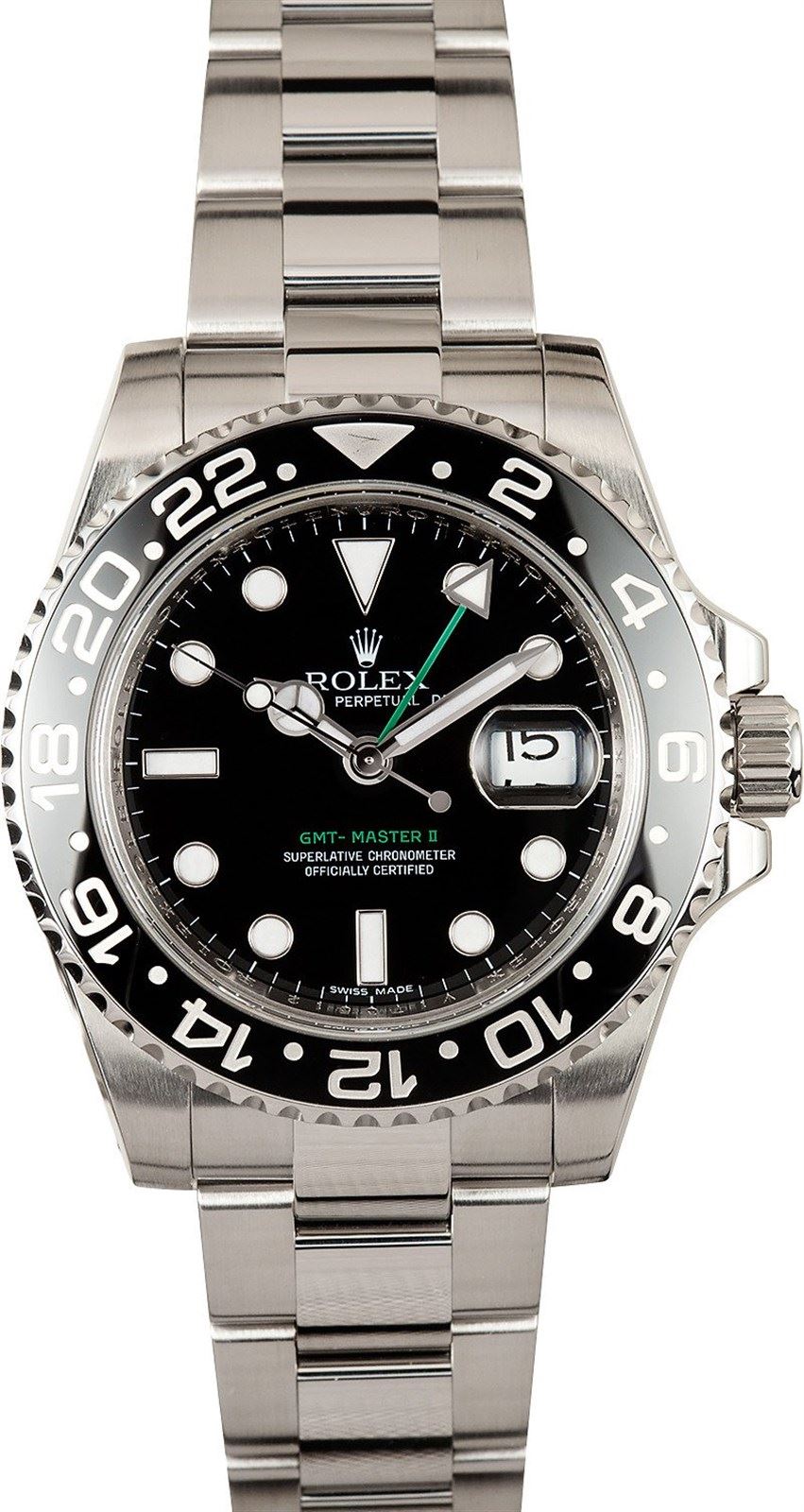 Model/Style-GMT-Master II 116710 Features-Automatic movement w/ date, Quickset, scratch-resistant sapphire crystal, waterproof screw-down crown Case-Stainless steel w/ 24 hour rotatable ceramic (Cerachrome) timing bezel (40mm), inner reflector ring engraved w/ serial number Bracelet-Stainless steel Oyster #9106