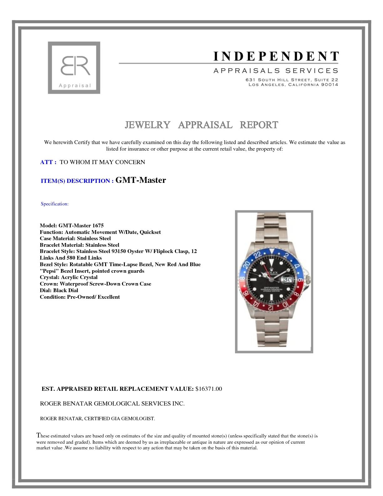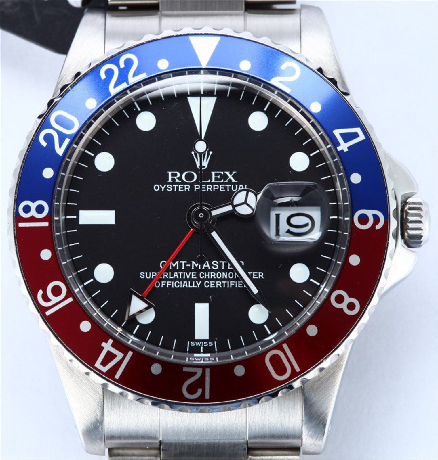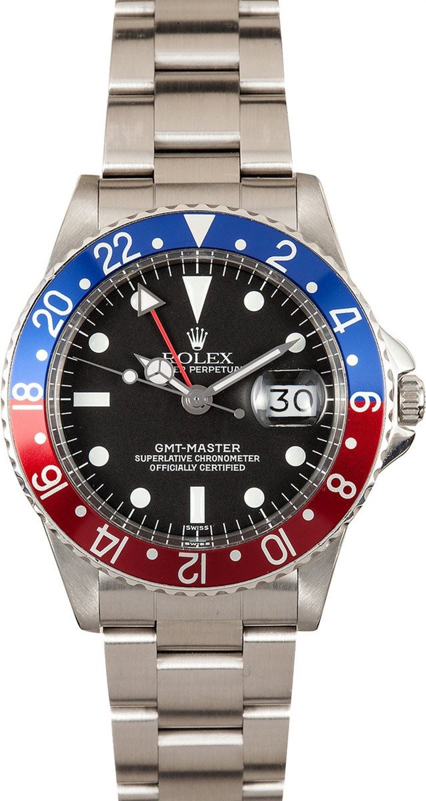 Model/Style-GMT-Master 1675 Features-Automatic movement w/ date, rotatable GMT time-lapse bezel, waterproof screw-down crown, acrylic crystal Case-Stainless steel w/ new red and blue "pepsi" bezel insert, pointed crown guards Bracelet-Stainless Steel 93150 Oyster w/ fliplock clasp, 12 links and 580 end links #9117