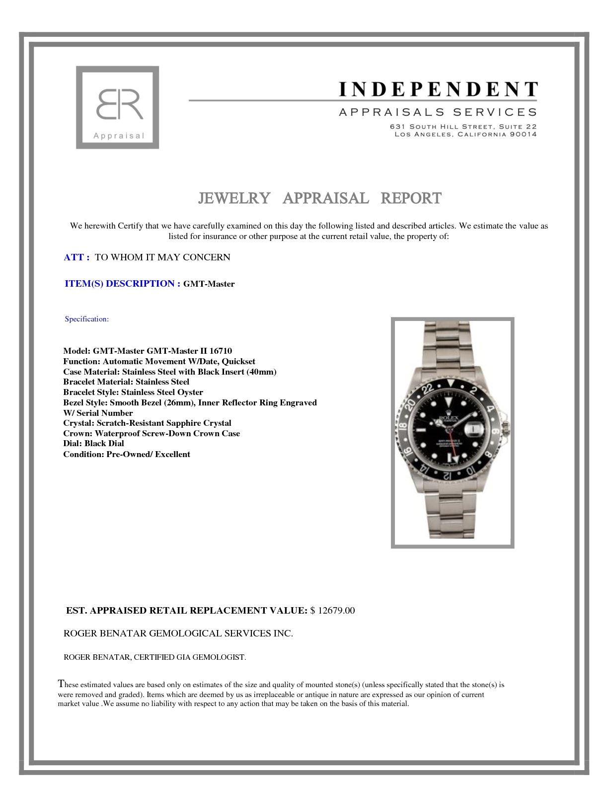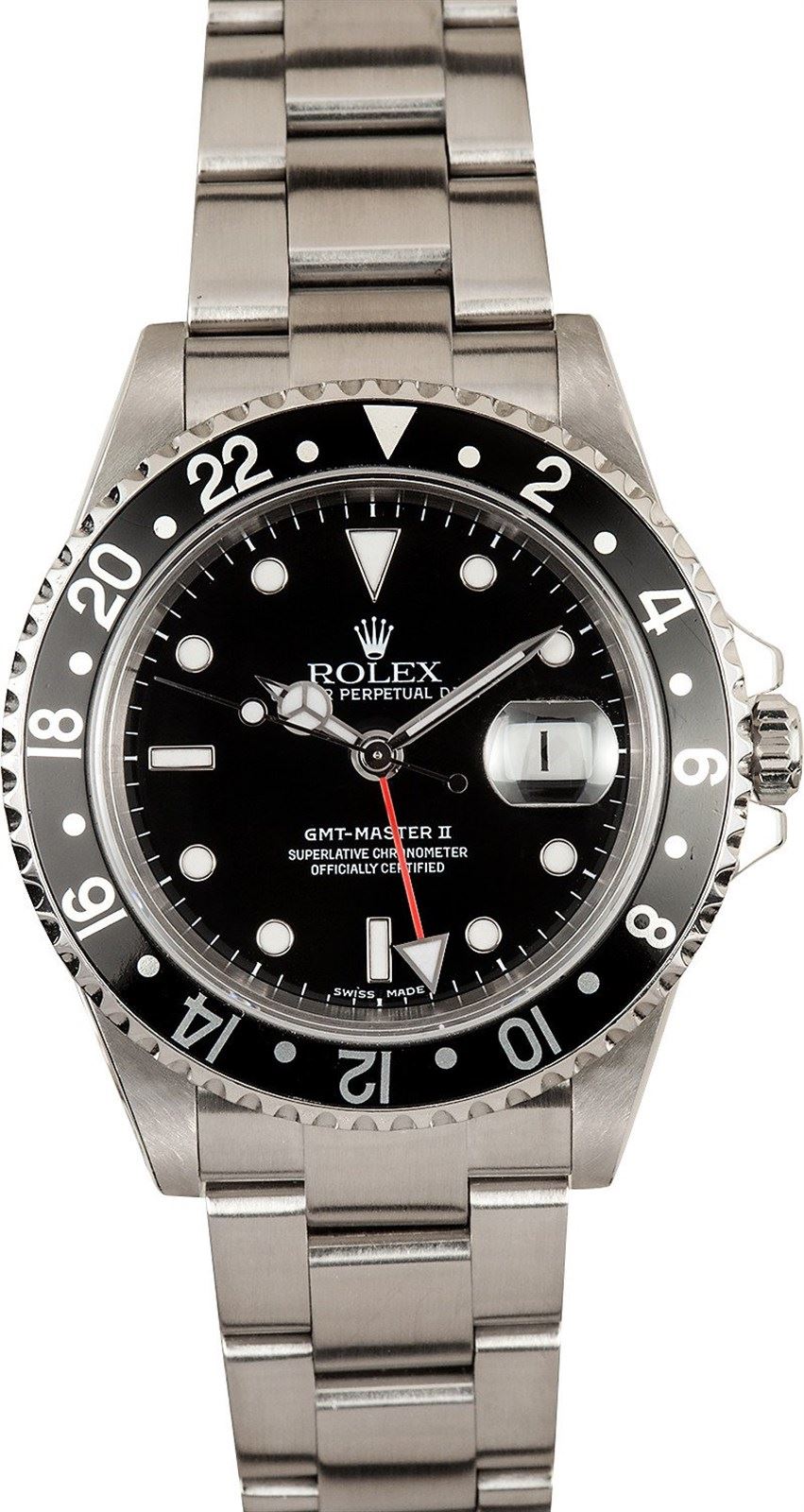 Model/Style-GMT-Master II 16710 Features-Automatic movement w/ date, Quickset, scratch resistant sapphire crystal Case-Stainless steel with black insert (40mm) Bracelet-Stainless steel Oyster #9108