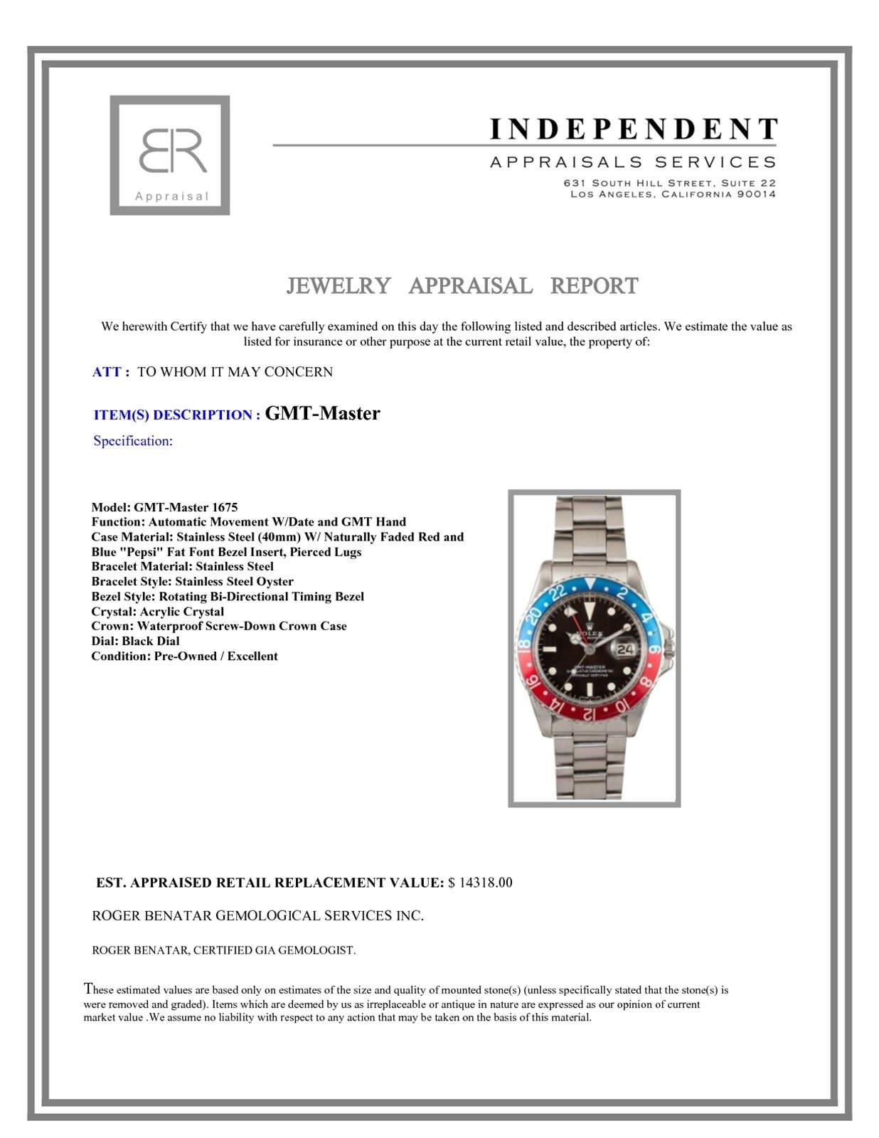 Model/Style-GMT-Master 1675 Features-Automatic movement w/date and GMT hand, acrylic crystal, waterproof screw-down crown, rotating bi-directional timing bezel Case-Stainless steel (40mm) w/ naturally faded red and blue "Pepsi" fat font bezel insert, pierced lugs. Case is in excellent condition w/ slightly rounded edges Bracelet- #9093