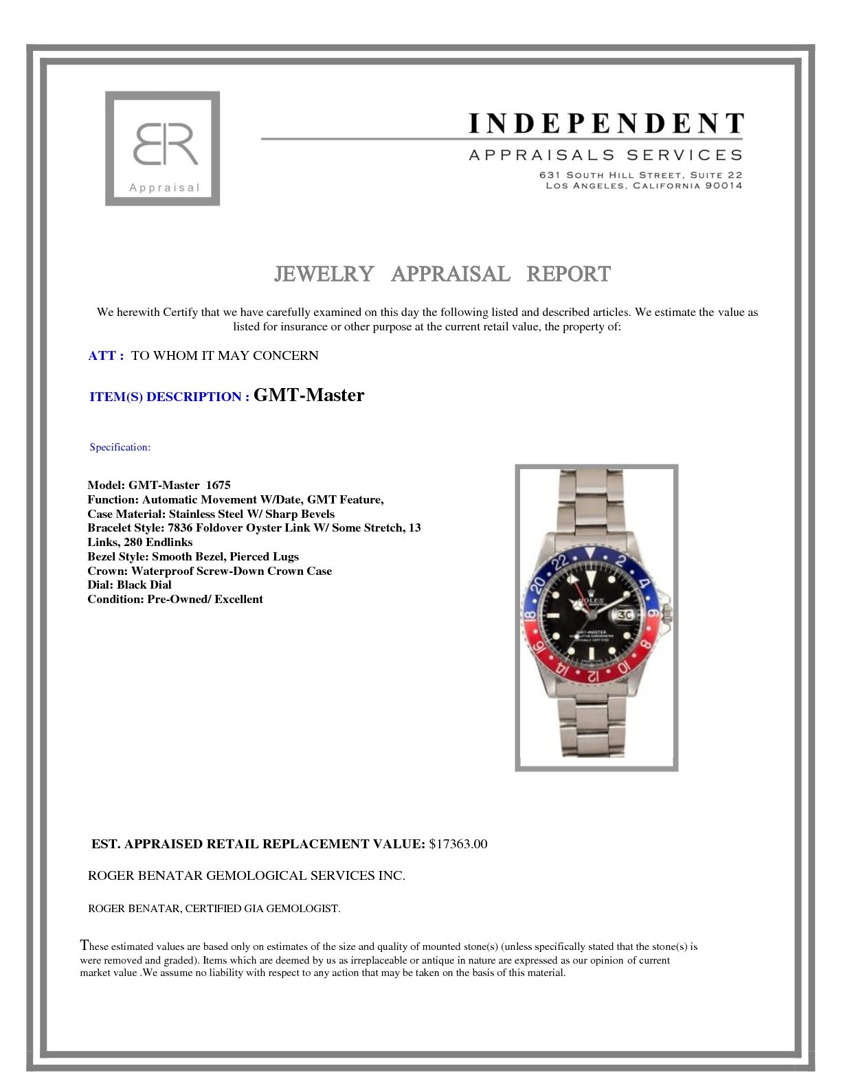 Not all jewelry, watches or loose stones are appraised and the appraisals are provided for bidders only in certain instances at the discretion of the Company. Appraisals, if any should be use to verify gemstone and or metal weights. The appraisals should not be used for valuation of any item. No guarantee, warranty or representation is intended by the Company in any appraisal. All dimensions and weights of such lots are approximate and are consistent with standards and practices in the industry. Condition reports are provided as a service to the prospective buyer. Bidders should take note that such descriptions are not warranties and that watches may need general service, change of battery or further repairs for which the buyer is solely responsible