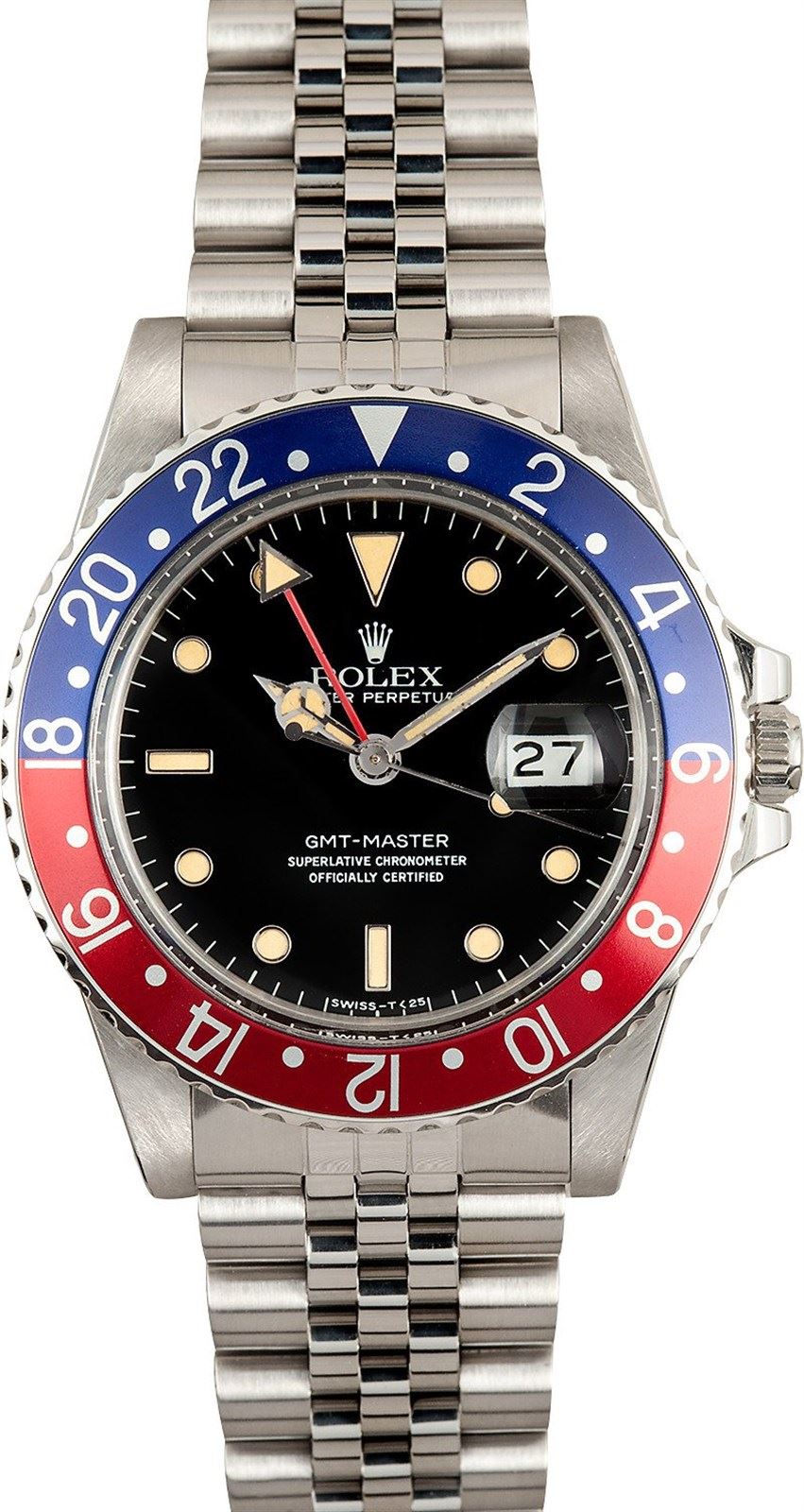 Model/Style-GMT-Master 16750 Features-Automatic quickset movement w/date, acrylic crystal, waterproof screw down crown, water resistant to 100m/330ft Case-Unpolished stainless steel with red and blue "Pepsi" rotating bi-directional timing bezel (40mm) Bracelet-Stainless steel Jubilee in excellent condition #9128