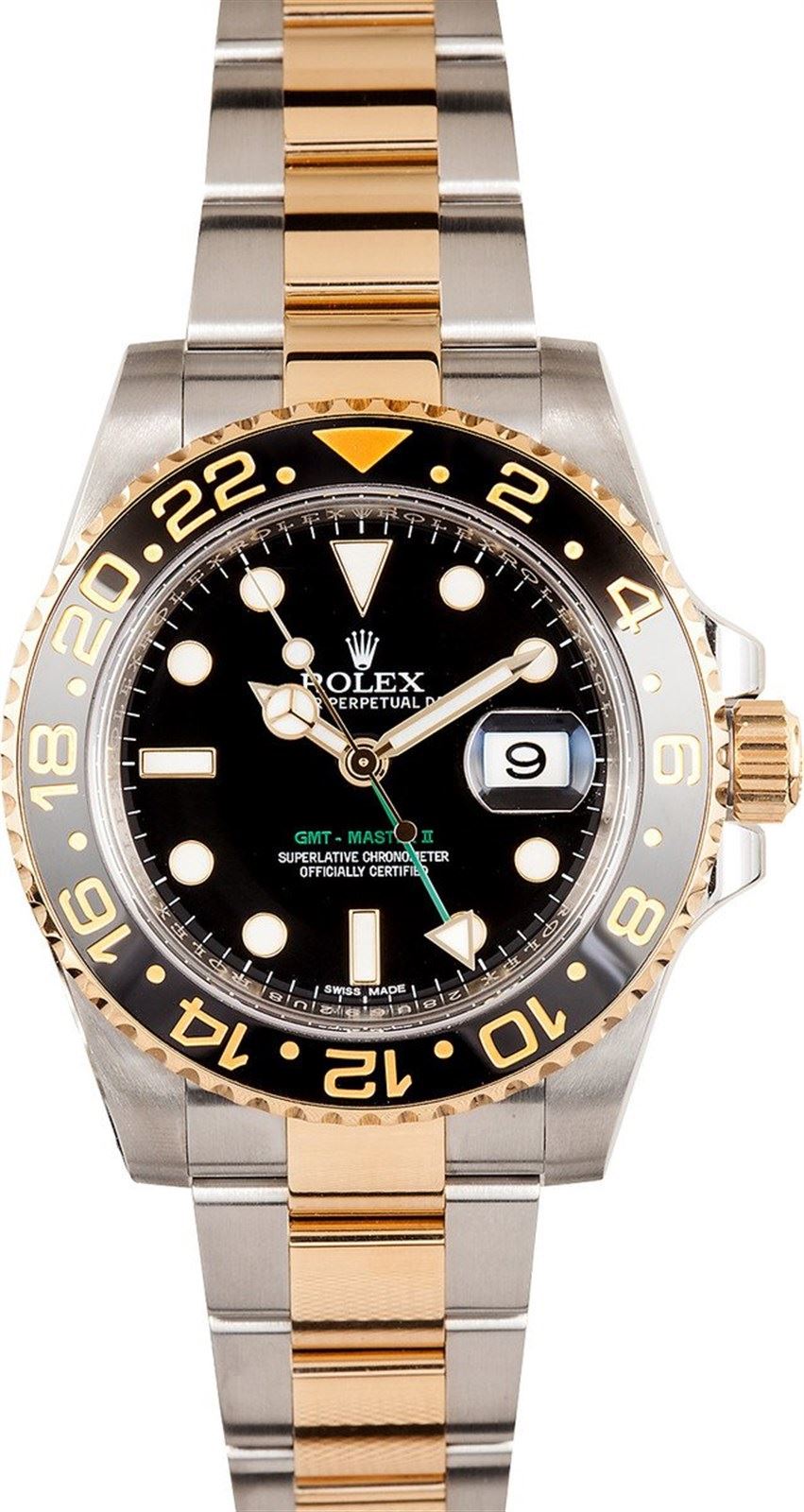 Model/Style-GMT Master II 116713 Features-Automatic GMT movement w/ date and 2nd time zone, Quickset, scratch-resistant sapphire crystal, waterproof, screw-down crown, rotating bi-directional timing bezel Case-Stainless steel w/ 18k yellow gold bezel with scratch-resistant rotatable ceramic bezel (40 mm diameter), inner reflector ring engraved w/ serial number, no holes Bracelet-Stainless steel & 18k yellow gold Oysterlock bracelet w/ Easylink #9081