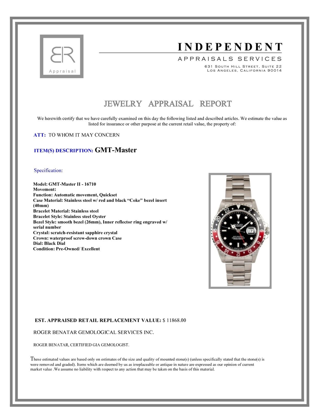 Model/Style-GMT-Master II - 16710 Features-Automatic movement, Quickset, scratch-resistant sapphire crystal, waterproof screw-down crown Case-Stainless steel w/ red and black "Coke" bezel insert (40mm) Bracelet-Stainless steel Oyster w/ fliplock clasp #9091