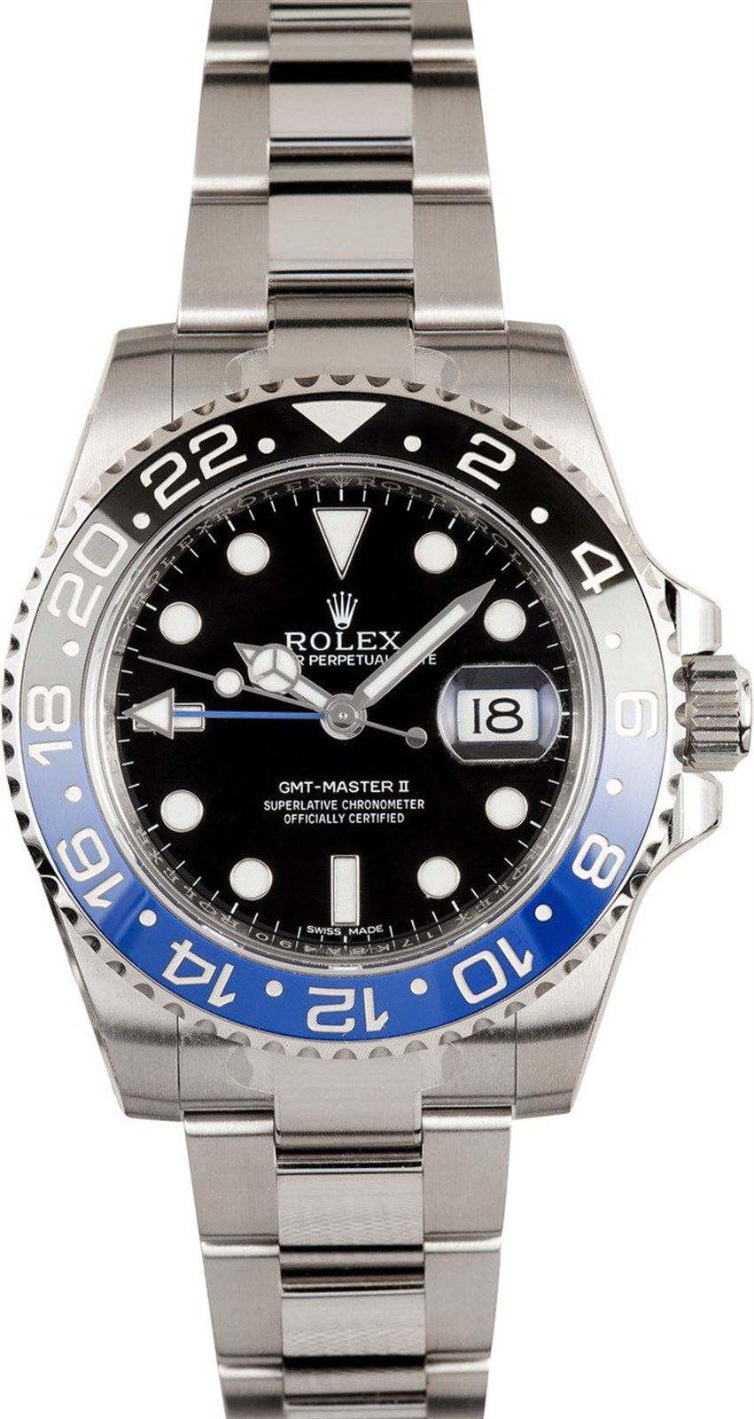 Model/Style-GMT-Master II 116710BLNR Features-Automatic GMT movement w/ date and 2nd time zone, waterproof, screw-down crown, scratch-resistant sapphire crystal, rotating bi-directional timing bezel Case-Stainless steel black & blue bezel w/ 24 hour ceramic insert (40mm diameter) Bracelet-Stainless steel Oyster #9105