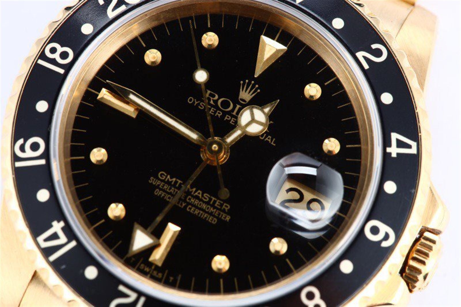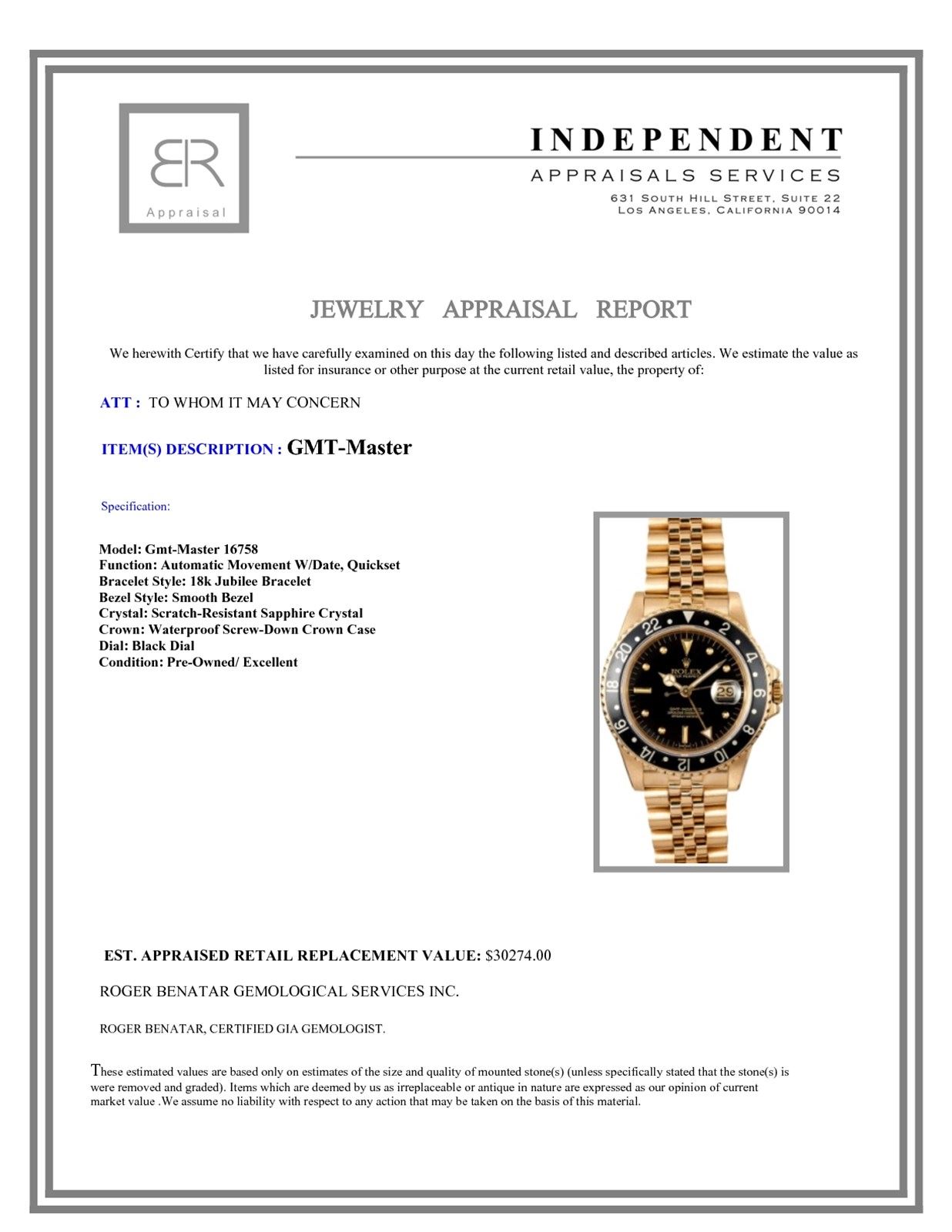Model/Style-GMT-Master 16758 Features-Automatic movement w/ date, quickset, scratch resistant sapphire crystal, waterproof screw-down crown Case-18k yellow gold (40mm). Case is in excellent condition with sharp beveled edges. Bracelet-Original 18k jubilee bracelet is in excellent condition #9080