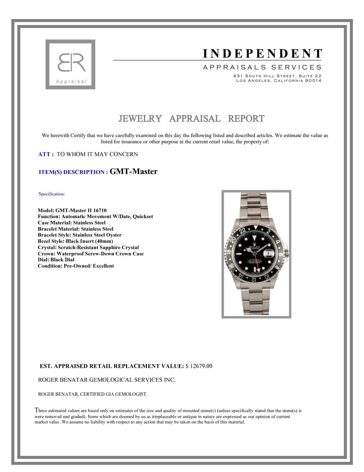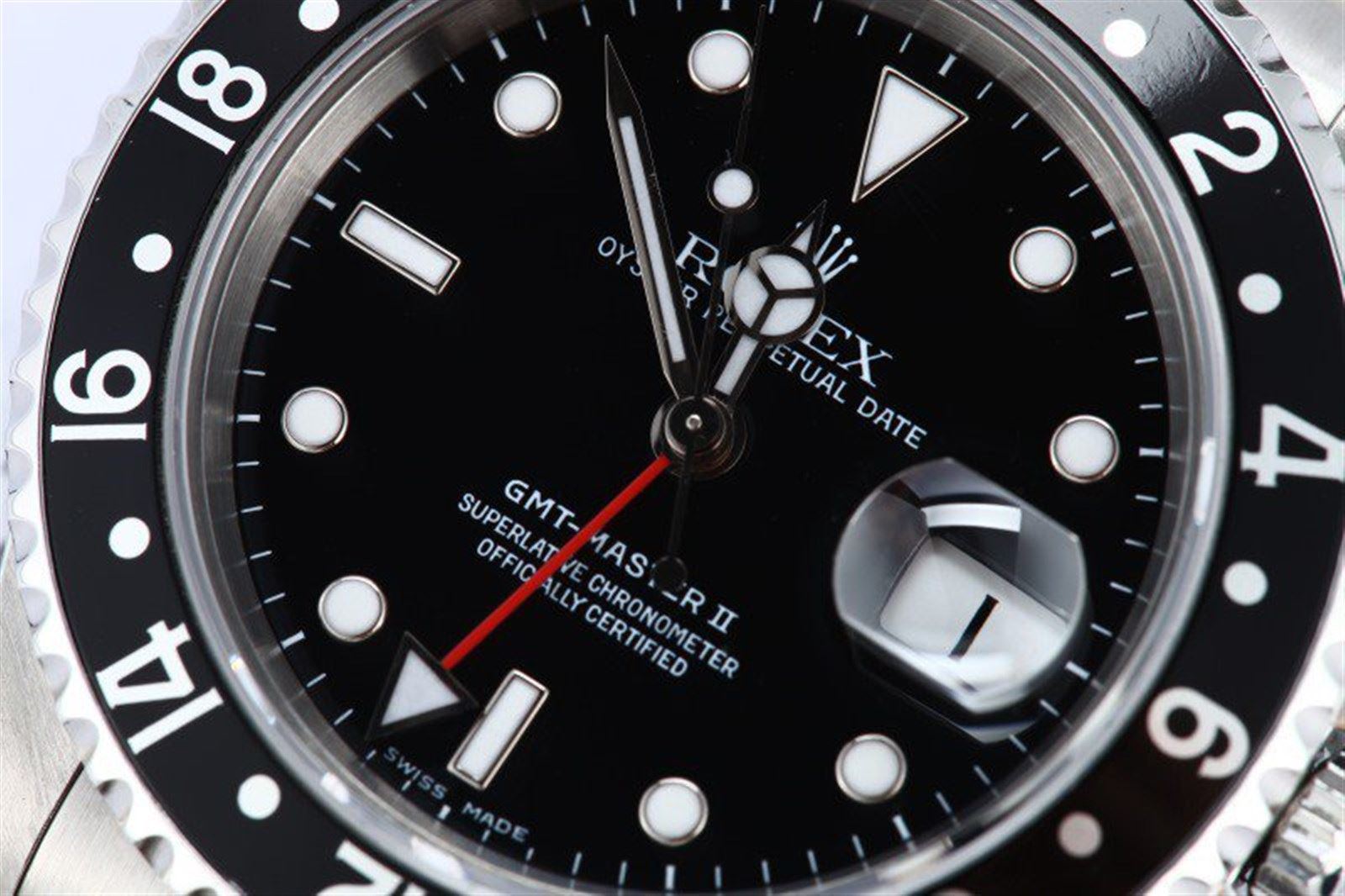 Model/Style-GMT-Master II 16710 Features-Automatic movement w/ date, Quickset, scratch resistant sapphire crystal Case-Stainless steel with black insert (40mm) Bracelet-Stainless steel Oyster #9087