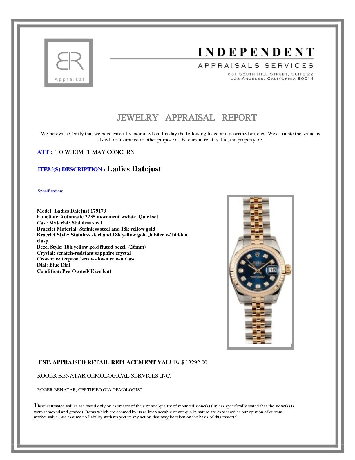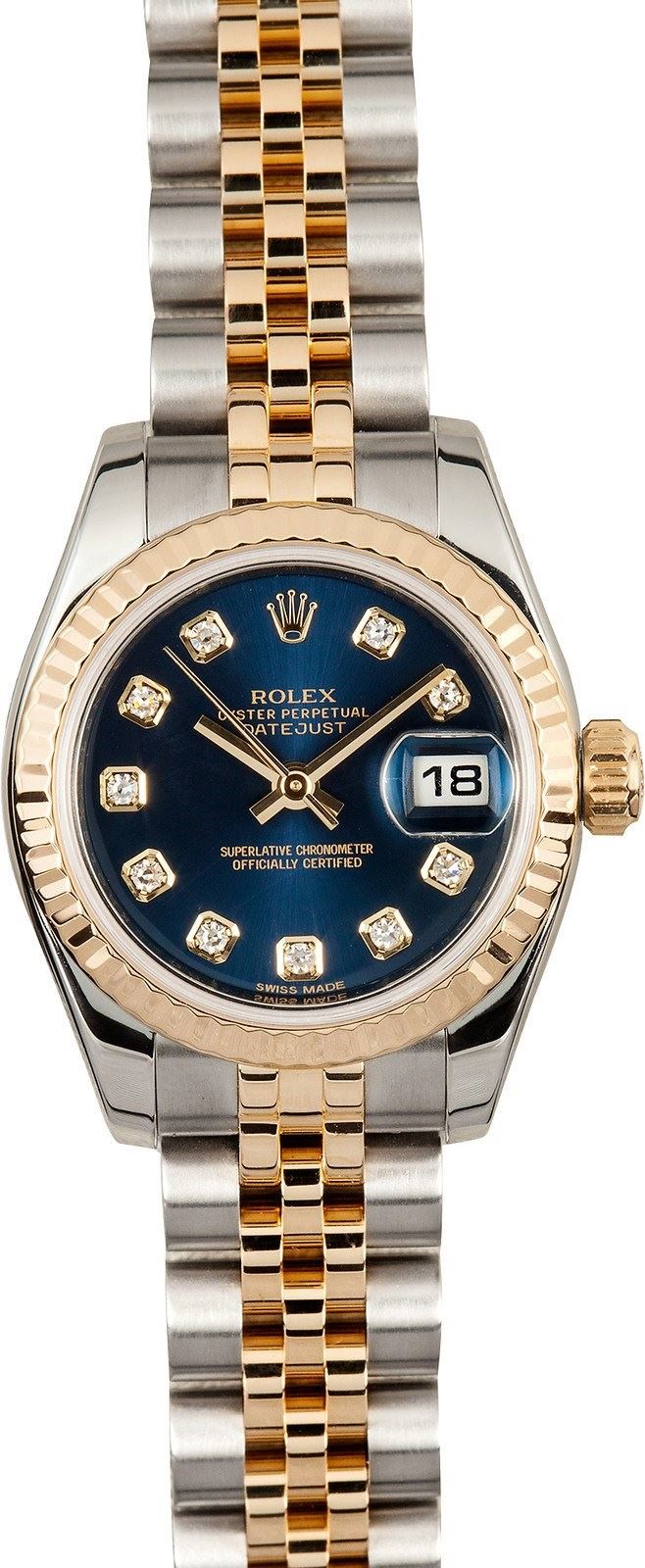 Model/Style-Ladies Datejust 179173 Serial/Year-Random Features-Automatic 2235 movement w/ date, Quickset, scratch-resistant sapphire crystal, waterproof screw-down crown Case-Stainless steel w/ 18k yellow gold fluted bezel (26mm) Bracelet-Stainless steel and 18k yellow gold Jubilee w/ hidden clasp #9138