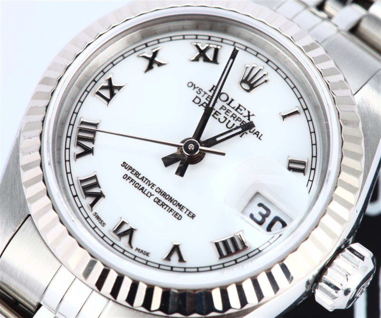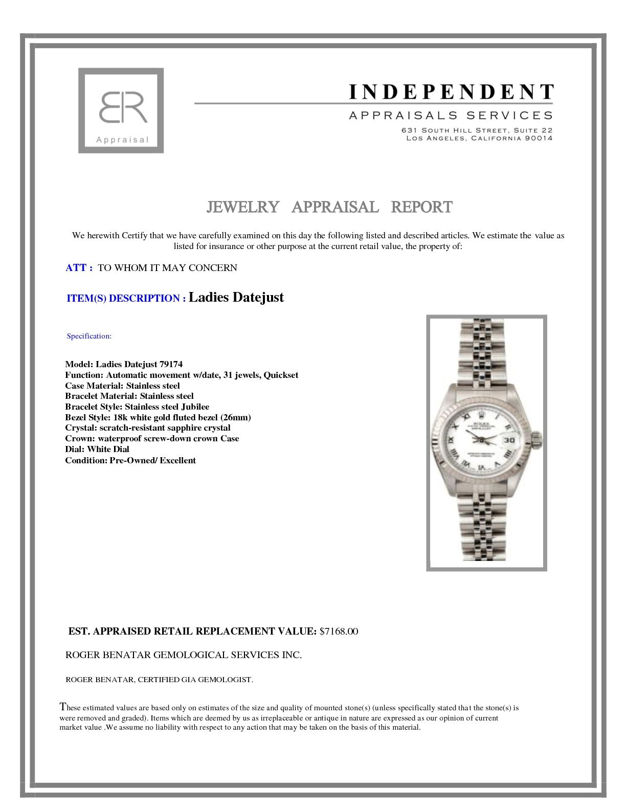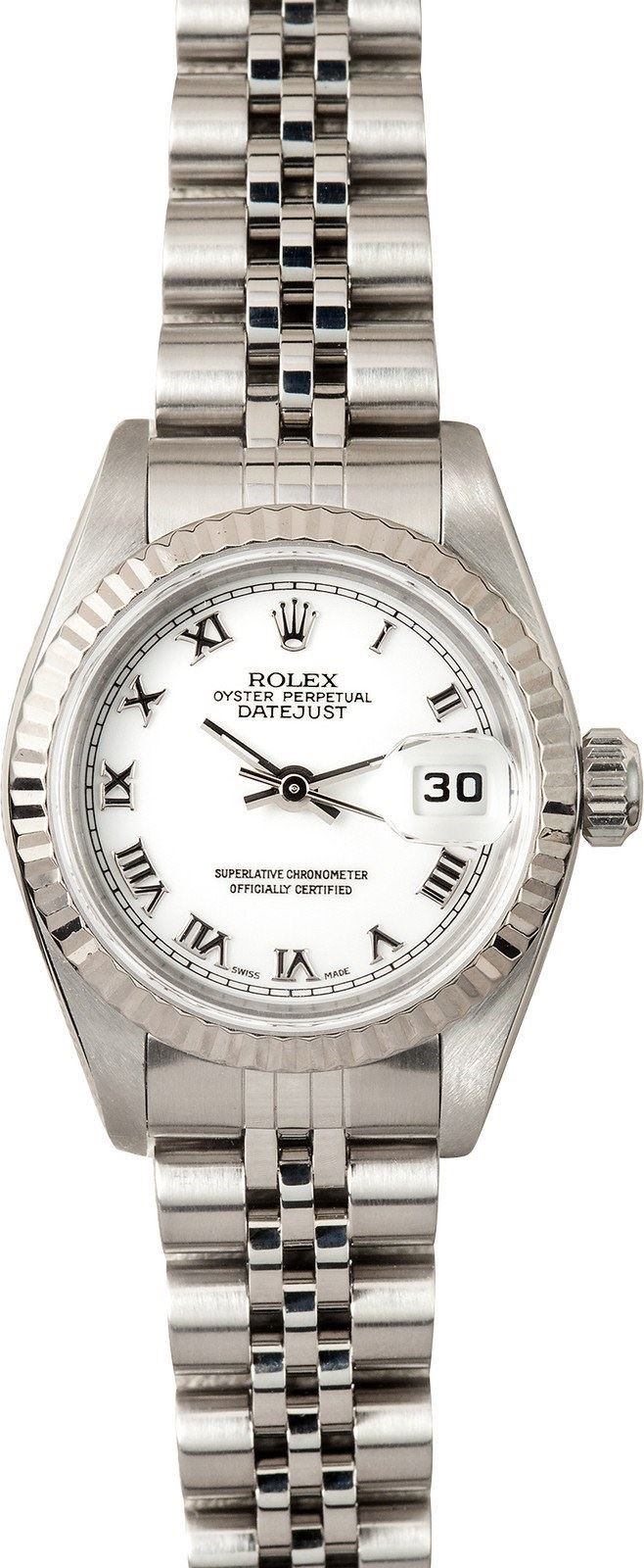 Model/Style-Ladies Datejust 79174 Serial/Year-Random Features-Automatic movement w/ date, 31 jewels, Quickset, scratch-resistant sapphire crystal, waterproof screw-down crown Case-Stainless steel w/ 18k white gold fluted bezel (26mm) Bracelet-Stainless steel Jubilee #9146