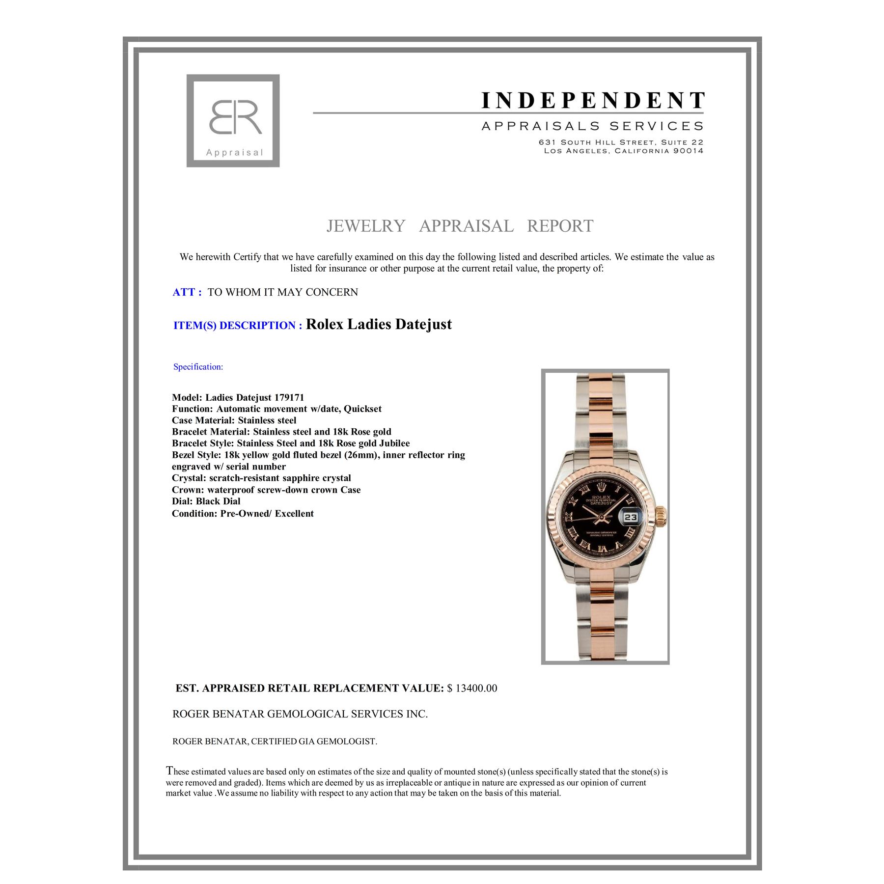Model/Style-Ladies Datejust 179171 Serial/Year-Random Features-Automatic movement w/ date, Quickset, scratch-resistant sapphire crystal, waterproof screw-down crown Case-Stainless steel w/ 18k rose gold fluted bezel  (26mm) Bracelet-Stainless steel and 18k rose gold Oyster  #9134