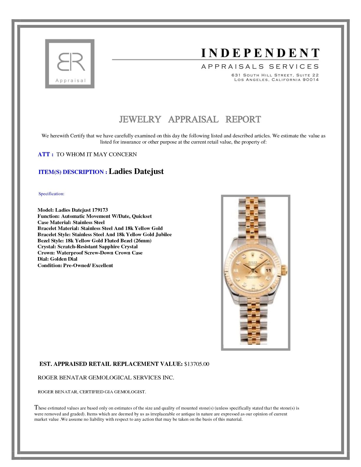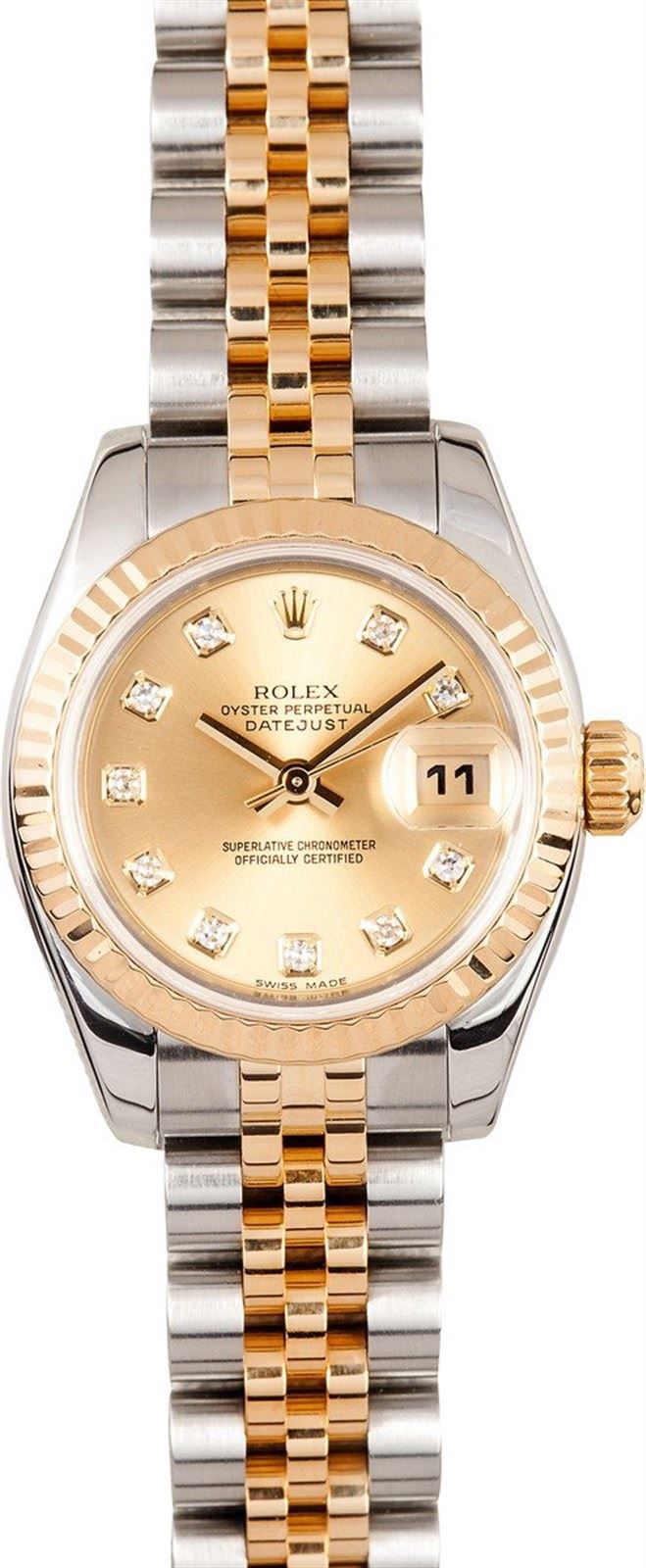 Model/Style-Ladies Datejust 179173 Serial/Year-Random Features-Automatic movement w/ date, Quickset, scratch-resistant sapphire crystal, waterproof screw-down crown Case-Stainless steel w/ 18k yellow gold fluted bezel (26mm) Bracelet-Stainless steel and 18k yellow gold Jubilee #9137