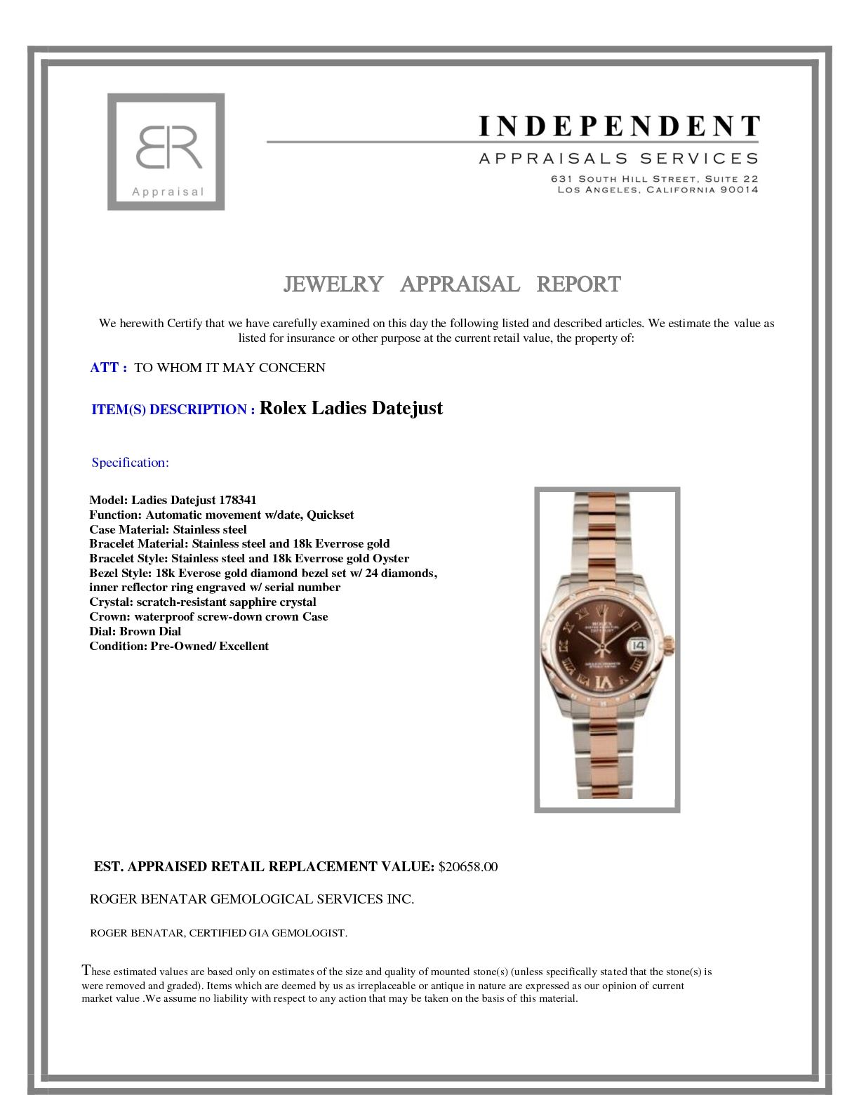 Not all jewelry, watches or loose stones are appraised and the appraisals are provided for bidders only in certain instances at the discretion of the Company. Appraisals, if any should be use to verify gemstone and or metal weights. The appraisals should not be used for valuation of any item. No guarantee, warranty or representation is intended by the Company in any appraisal. All dimensions and weights of such lots are approximate and are consistent with standards and practices in the industry. Condition reports are provided as a service to the prospective buyer. Bidders should take note that such descriptions are not warranties and that watches may need general service, change of battery or further repairs for which the buyer is solely responsible
