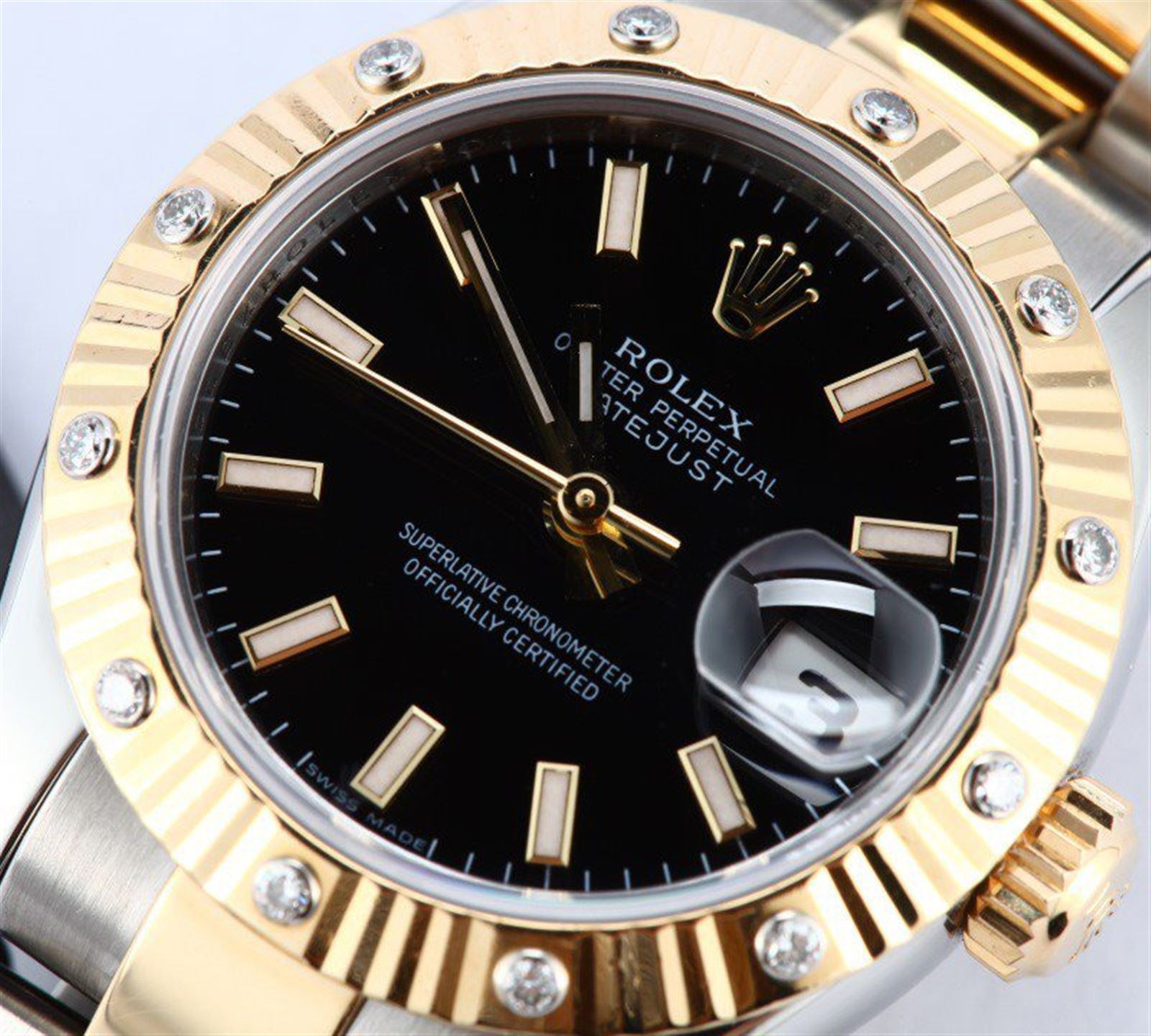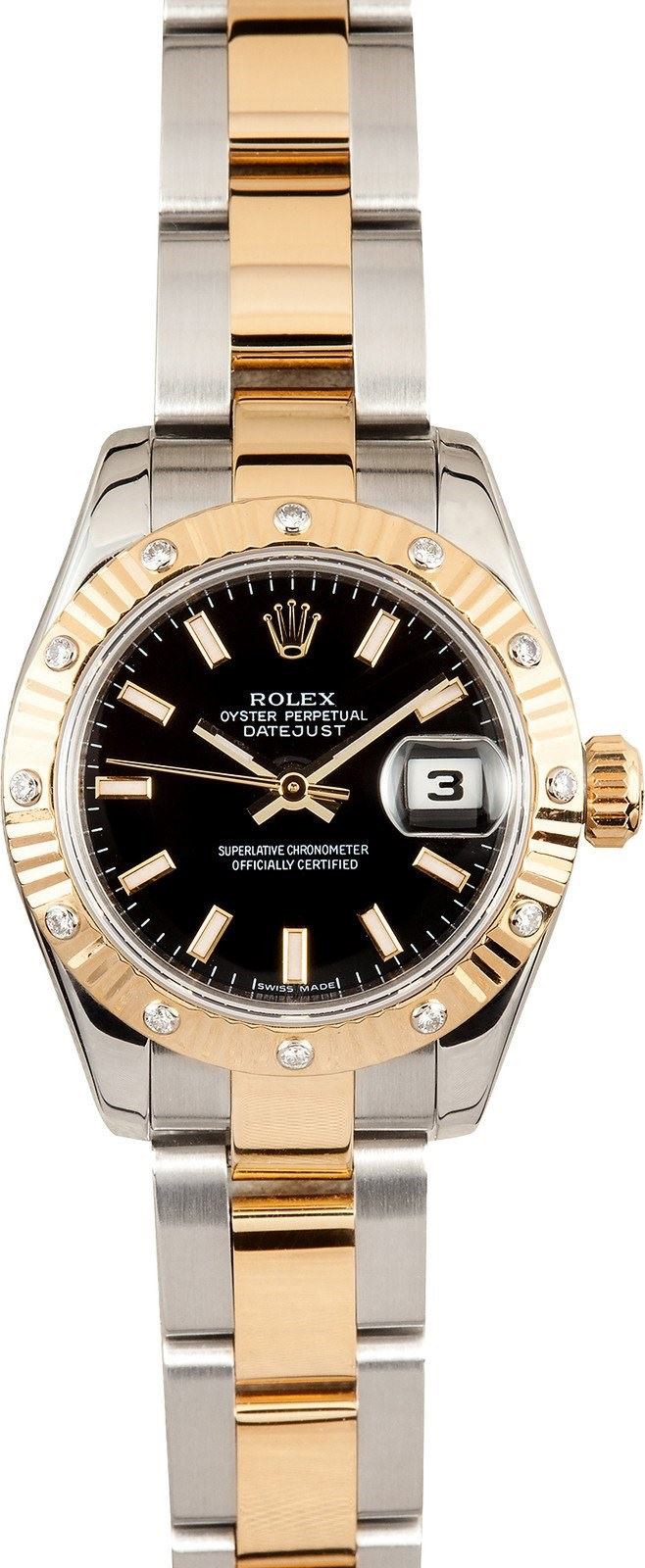 Model/Style-Ladies Datejust 179313 Features-Automatic movement w/ date, scratch-resistant sapphire crystal, waterproof screw-down crown, quickset Case-Stainless steel w/ 18k yellow gold and twelve diamond fluted bezel (26mm) Bracelet-Stainless Steel and 18k yellow gold Oyster #9142