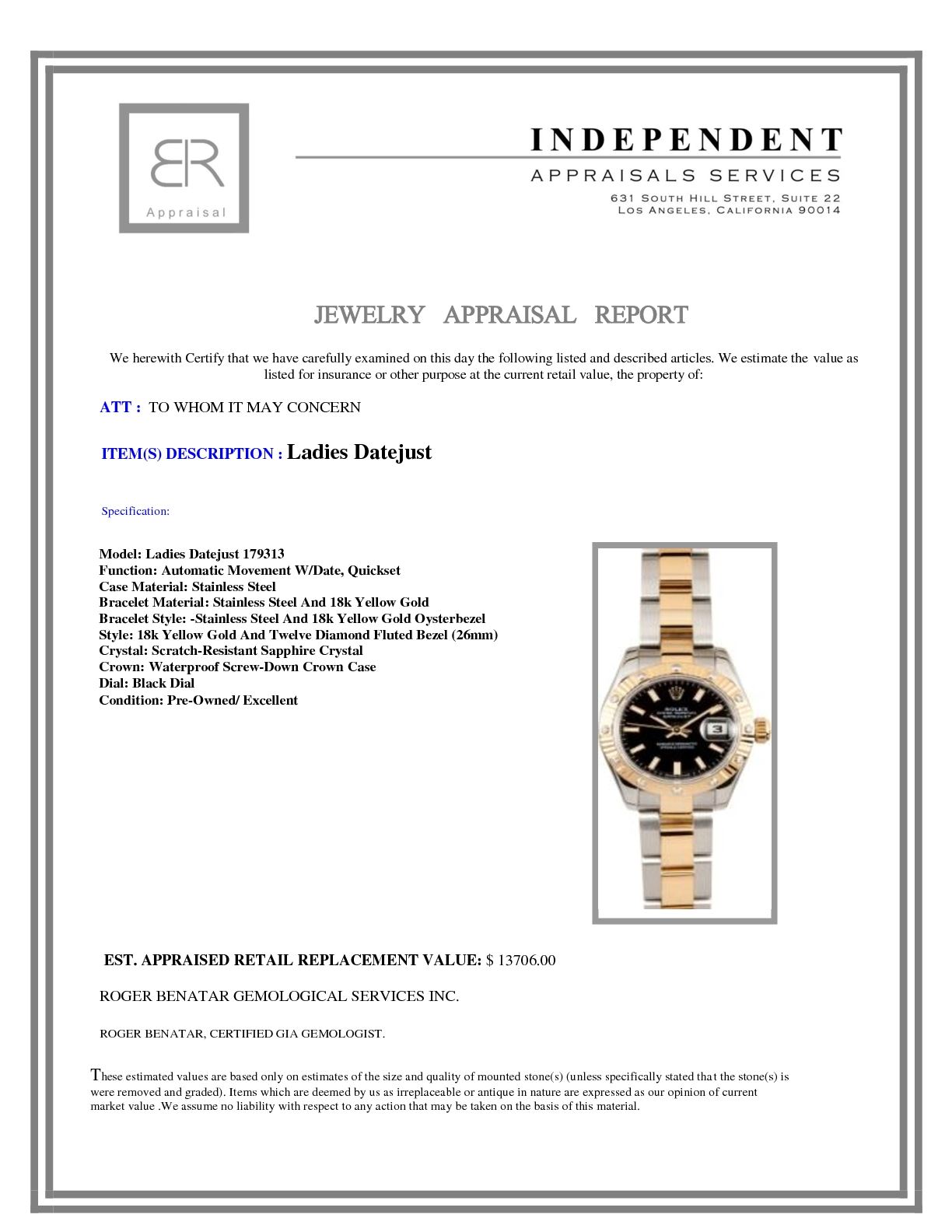 Not all jewelry, watches or loose stones are appraised and the appraisals are provided for bidders only in certain instances at the discretion of the Company. Appraisals, if any should be use to verify gemstone and or metal weights. The appraisals should not be used for valuation of any item. No guarantee, warranty or representation is intended by the Company in any appraisal. All dimensions and weights of such lots are approximate and are consistent with standards and practices in the industry. Condition reports are provided as a service to the prospective buyer. Bidders should take note that such descriptions are not warranties and that watches may need general service, change of battery or further repairs for which the buyer is solely responsible