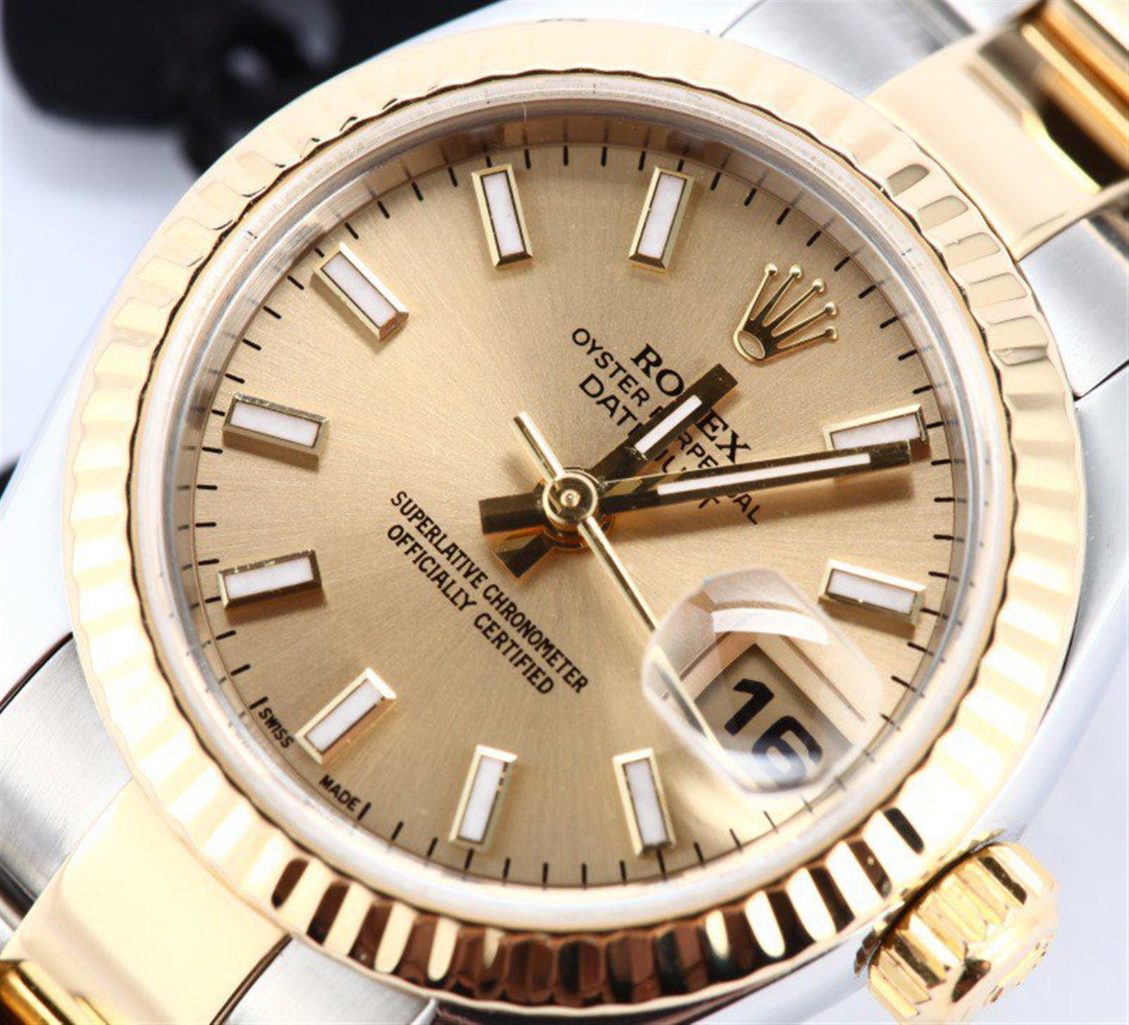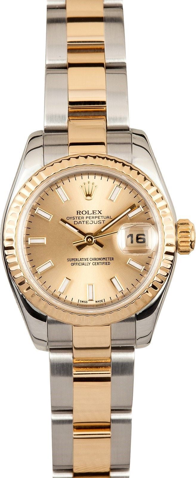 Model/Style-Ladies Datejust 179163 Features-Automatic movement w/ date, Quickset, scratch-resistant sapphire crystal, waterproof screw-down crown Case-Stainless steel w/ 18k yellow gold smooth bezel (26mm) Bracelet-Stainless steel and 18k yellow gold Oyster #9144