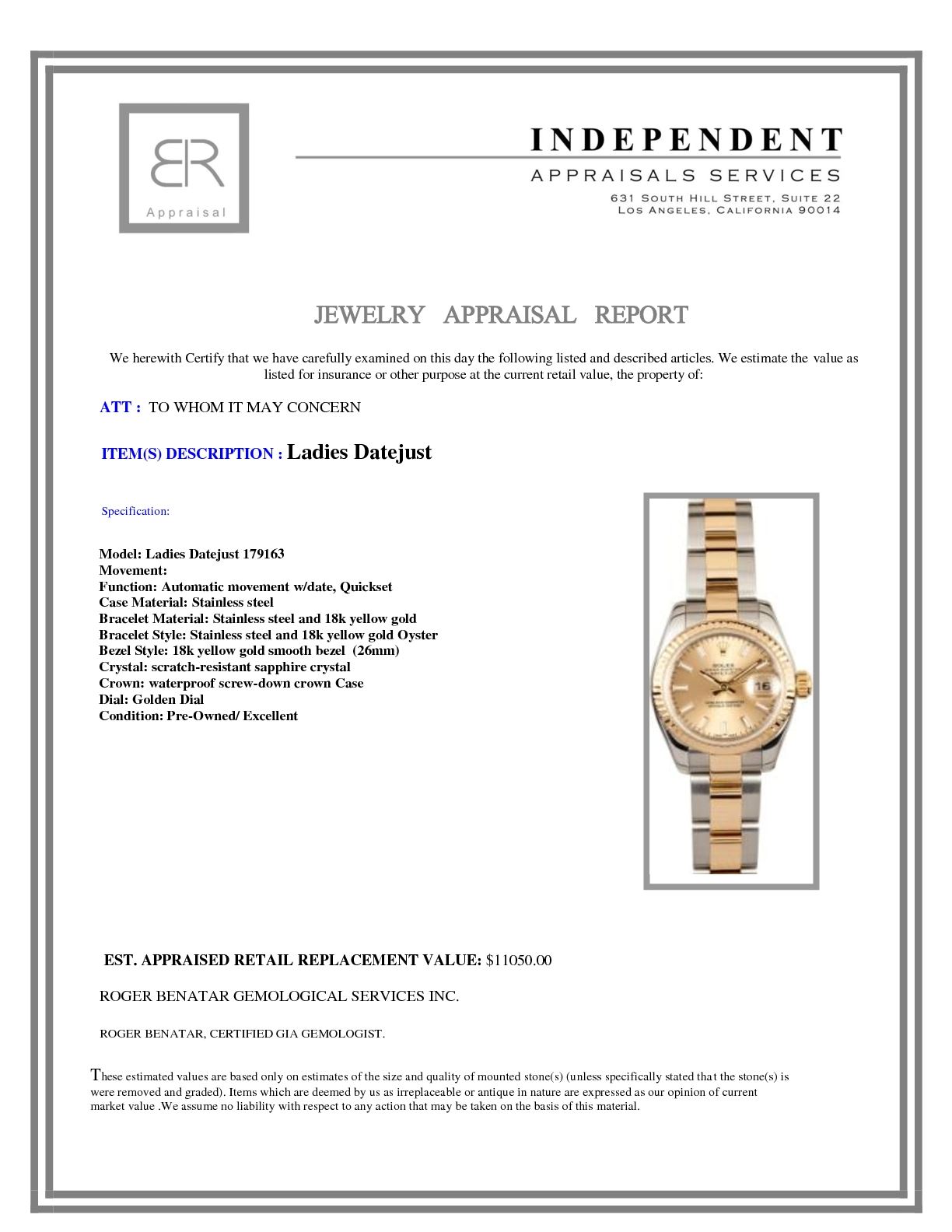 Not all jewelry, watches or loose stones are appraised and the appraisals are provided for bidders only in certain instances at the discretion of the Company. Appraisals, if any should be use to verify gemstone and or metal weights. The appraisals should not be used for valuation of any item. No guarantee, warranty or representation is intended by the Company in any appraisal. All dimensions and weights of such lots are approximate and are consistent with standards and practices in the industry. Condition reports are provided as a service to the prospective buyer. Bidders should take note that such descriptions are not warranties and that watches may need general service, change of battery or further repairs for which the buyer is solely responsible