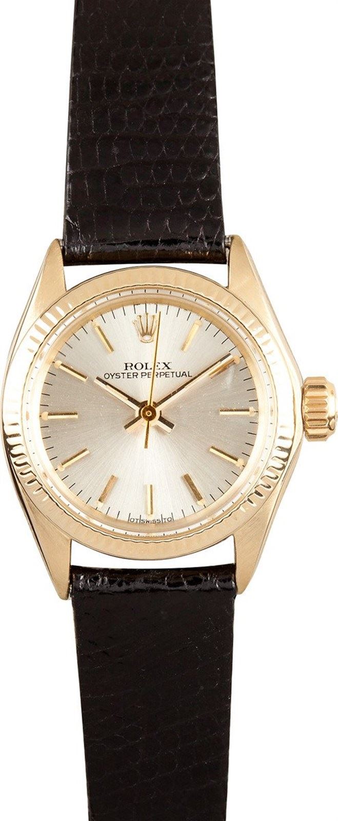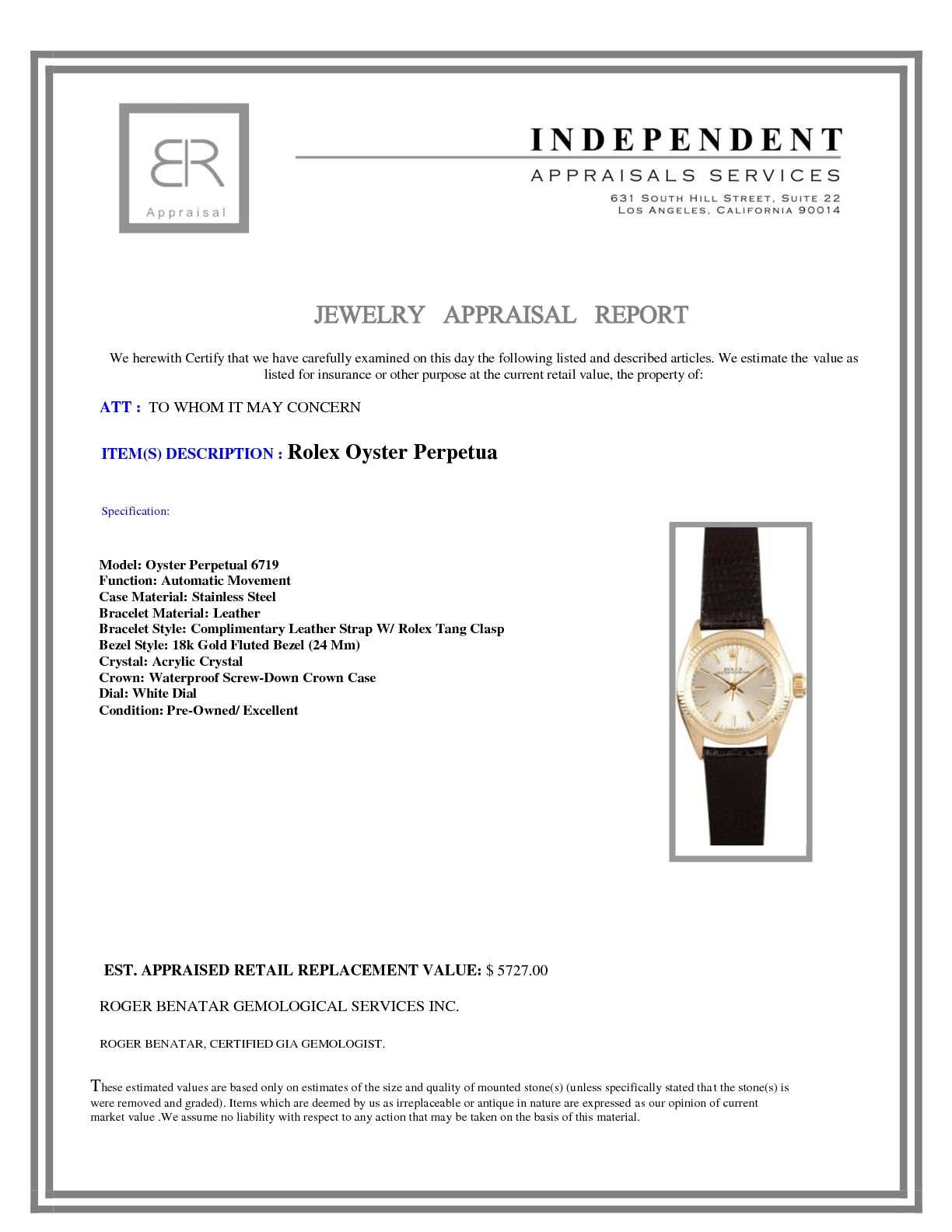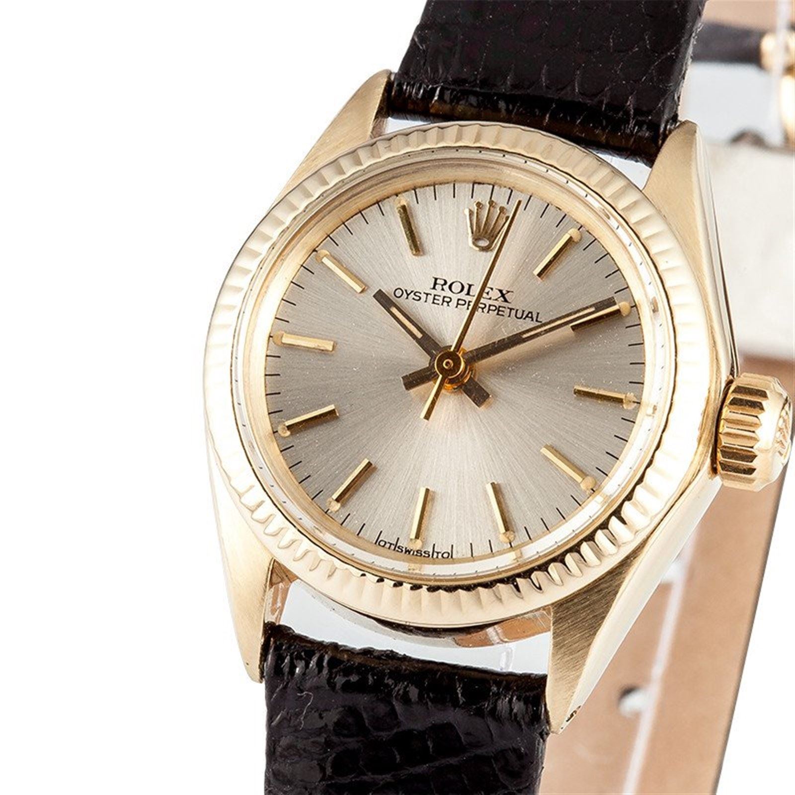 Model/Style-Oyster Perpetual 6719 Serial/Year-Random Features-Automatic movement, waterproof screw-down crown, acrylic crystal Case-Gold case w/ 18k gold fluted bezel (24 mm) Bracelet-Complimentary leather strap w/ Rolex tang clasp #9170