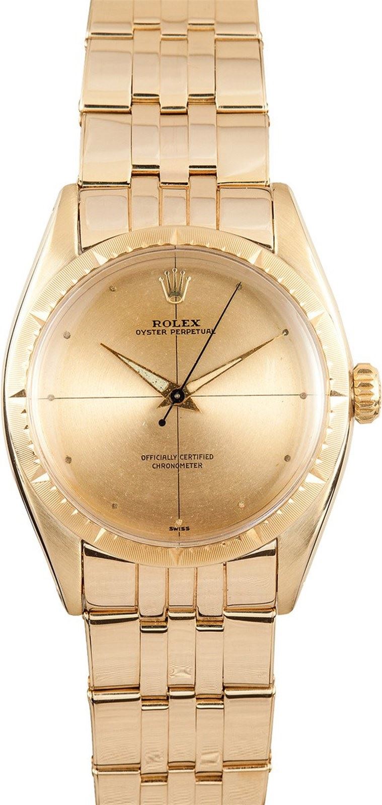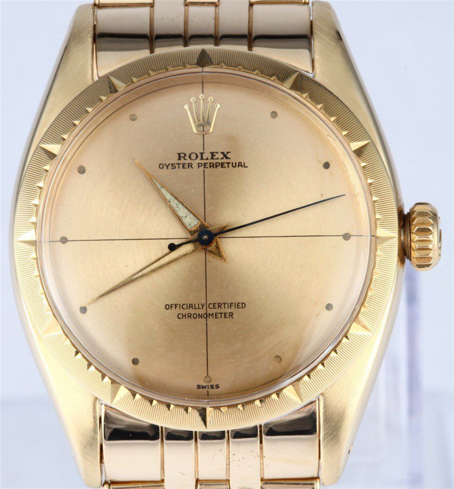 Model/Style-Oyster Perpetual 6582 Features-Automatic movement, waterproof screw-down crown, acrylic crystal, total gram weight is 63.3, pierced lugs Case-14k yellow gold Bracelet-14K gold Rolex Extension Link - Fits a 7.5 inch wrist. #9153