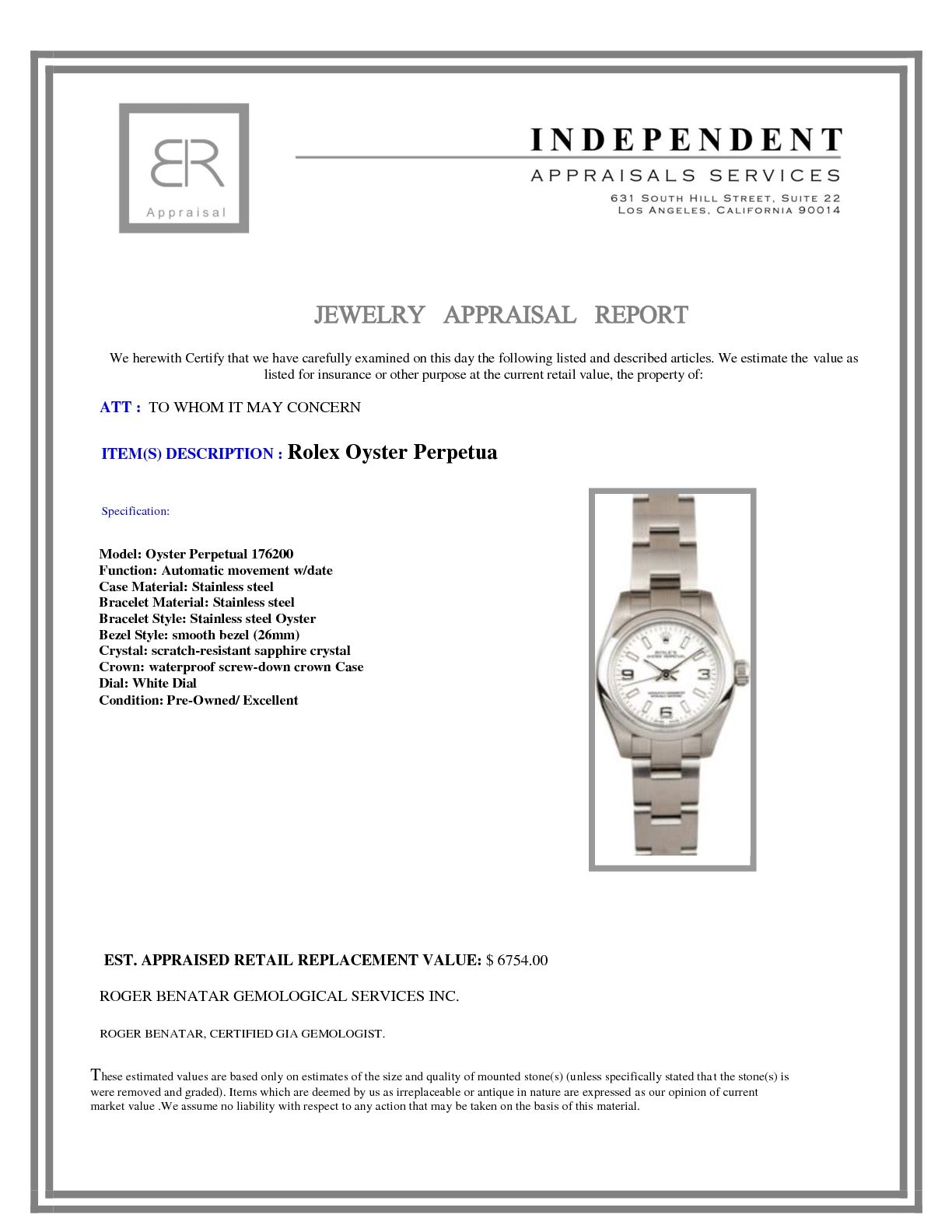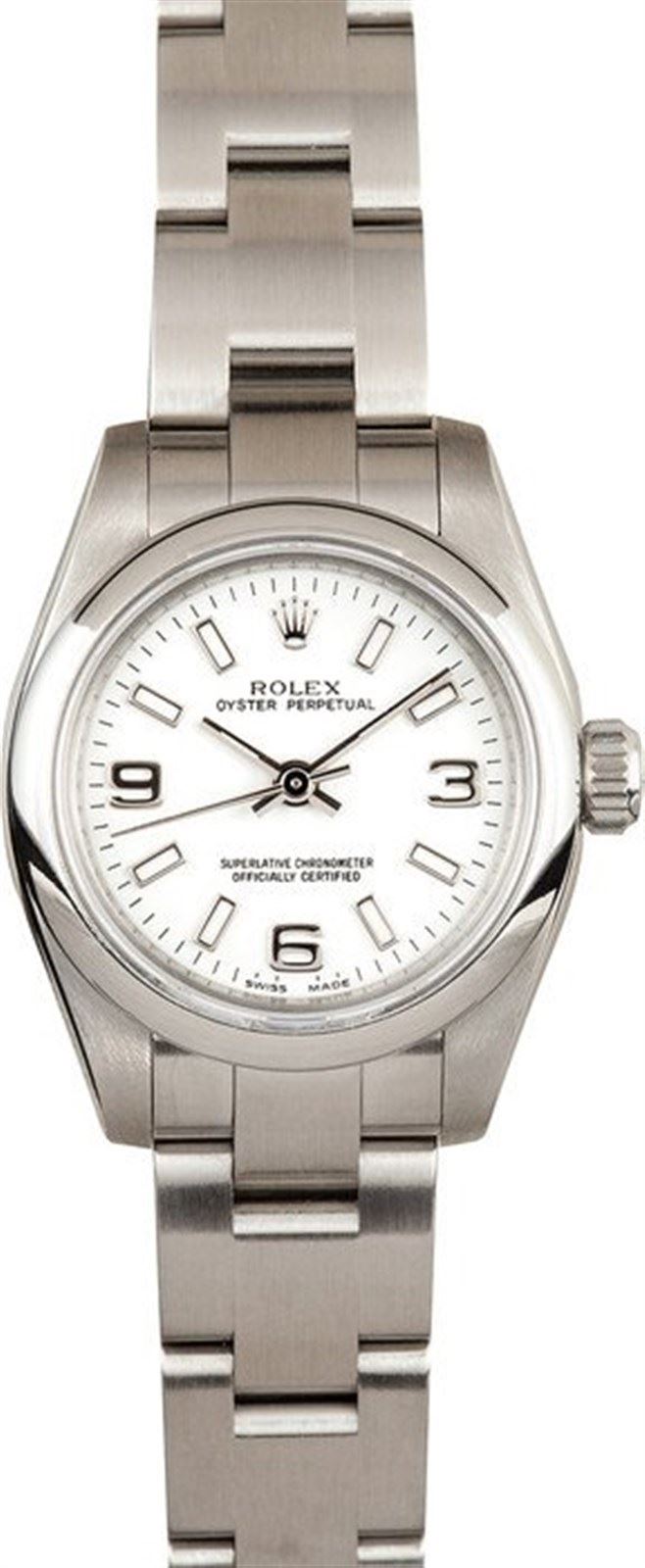 Model/Style-Oyster Perpetual 176200 Features-Automatic movement w/ date, scratch-resistant sapphire crystal, waterproof screw-down crown Case-Stainless steel w/ smooth bezel (26mm) Bracelet-Stainless steel Oyster #9156