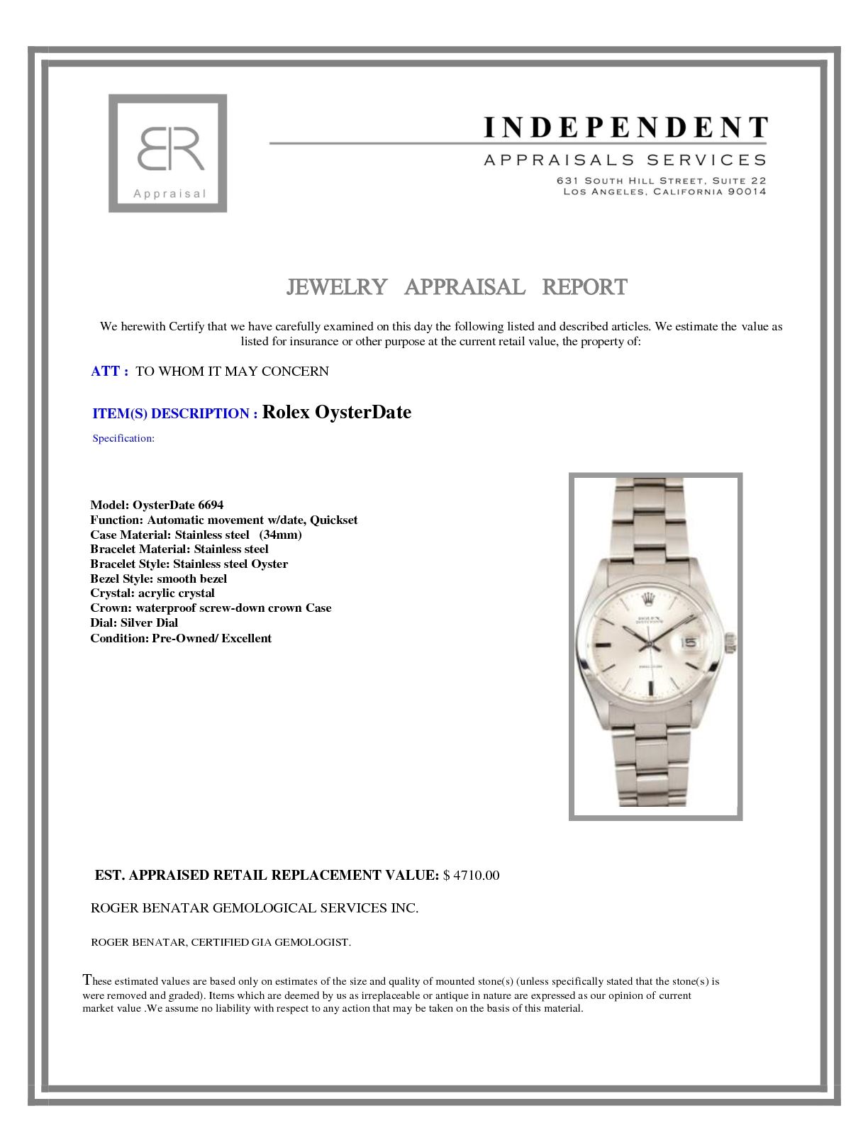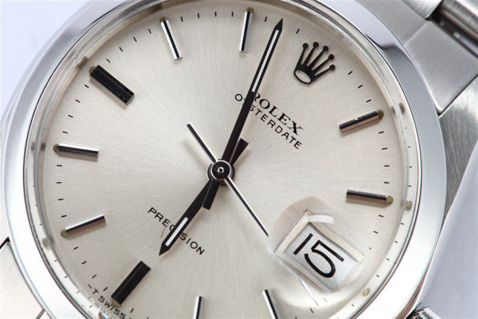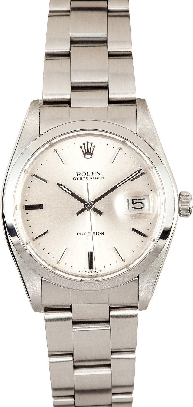 Model/Style-OysterDate 6694 Features-Manual winding w/ date, acrylic crystal, waterproof screw-down crown Case-Stainless steel (34mm) w/ smooth bezel Bracelet-Stainless Steel Oyster #9149