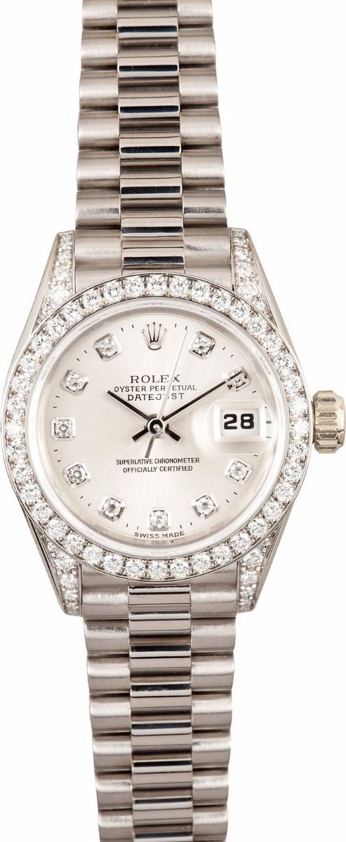 Model/Style-President 69159 Serial/Year-Random Features-Automatic movement w/ date, Quickset date, scratch-resistant sapphire crystal, waterproof screw-down crown Case-18k white gold w/ diamond bezel and 24 diamond set lugs (26mm) Bracelet-18k white gold President w/ hidden-clasp *Bracelet fits 5.5 wrist. Extra links may be purchased, but discount has been applied #9178
