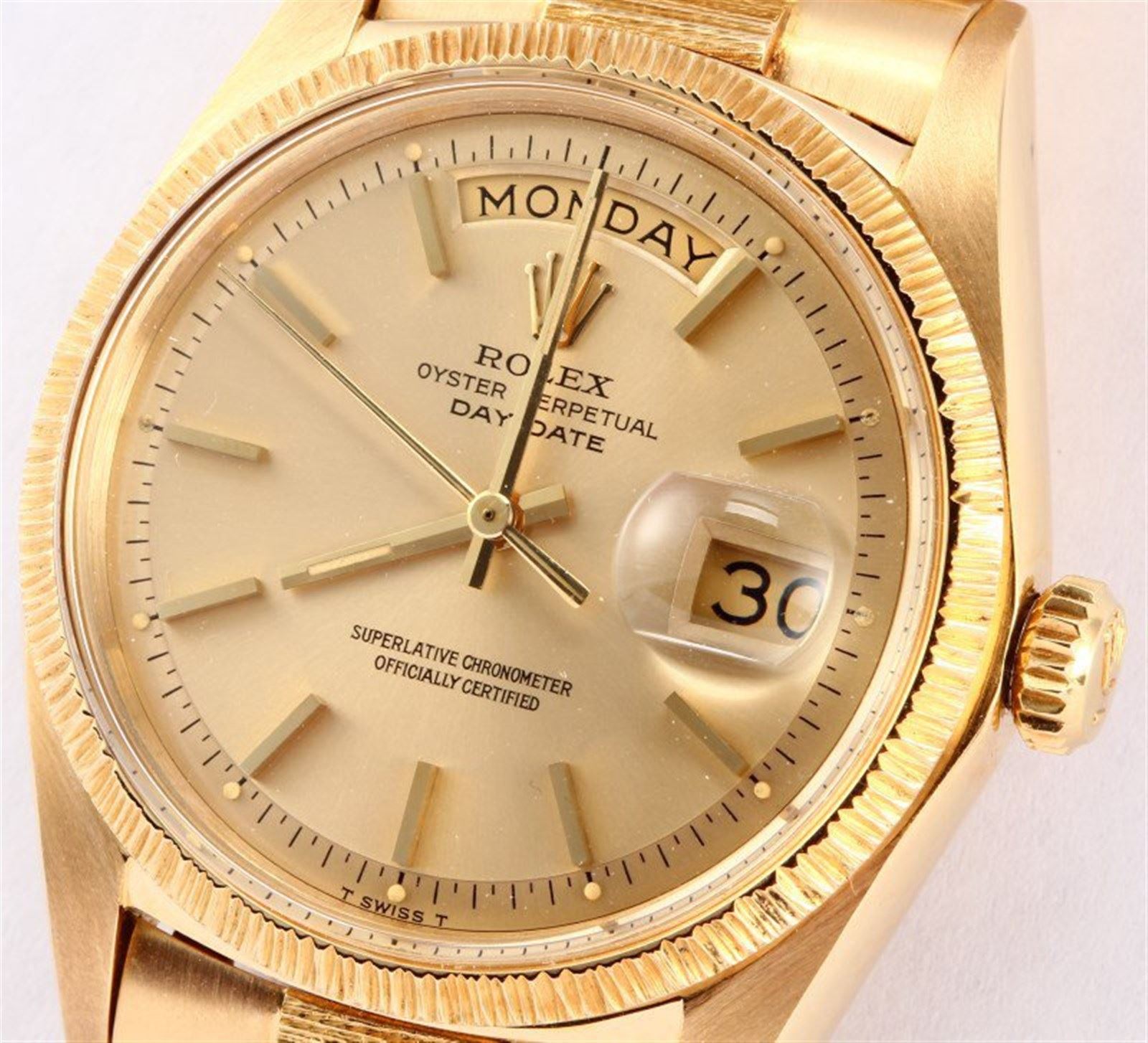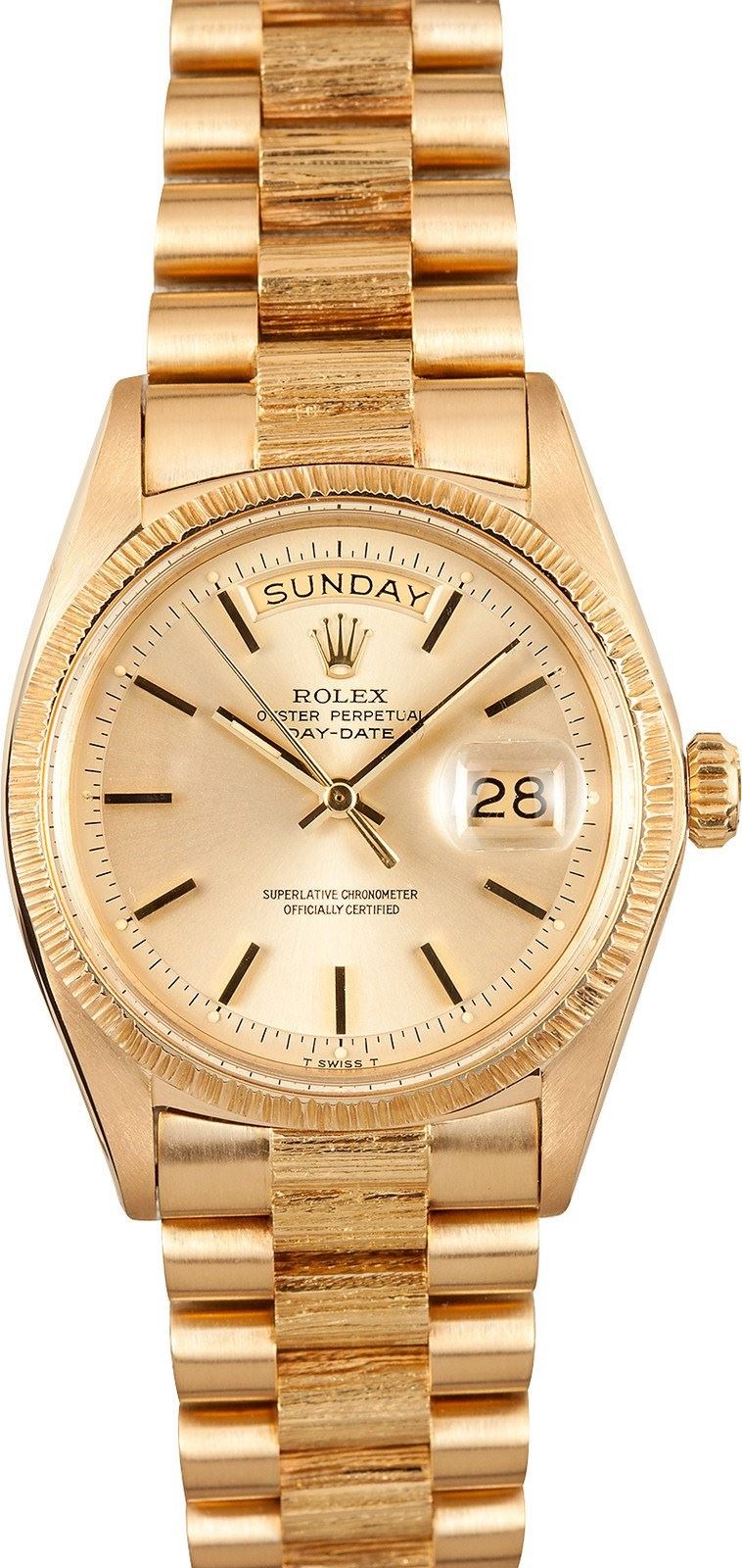 Model/Style-President 1807 Serial/Year-Random Features-Automatic movement w/ day-date, acrylic crystal, waterproof screw-down crown Case-18k yellow gold w/ bark finished bezel Bracelet-18K Yellow gold Presidential w/ barked center links and Oyster buckle #9176