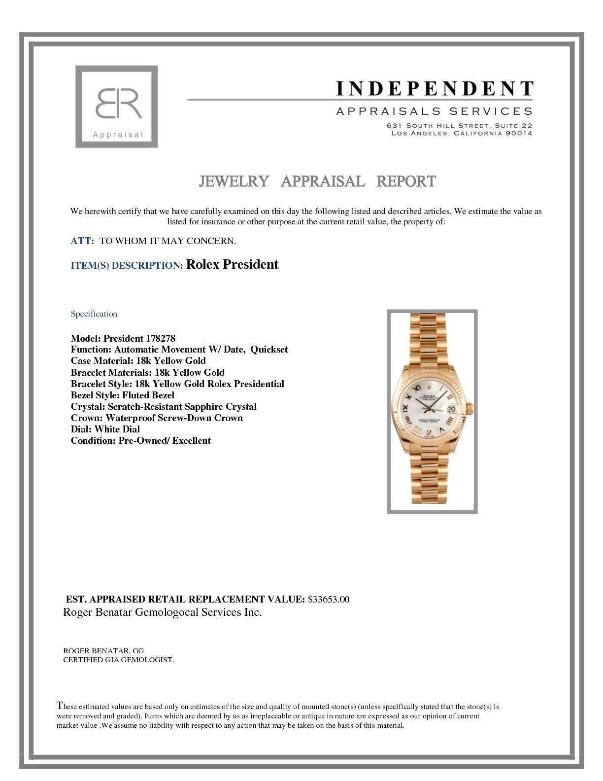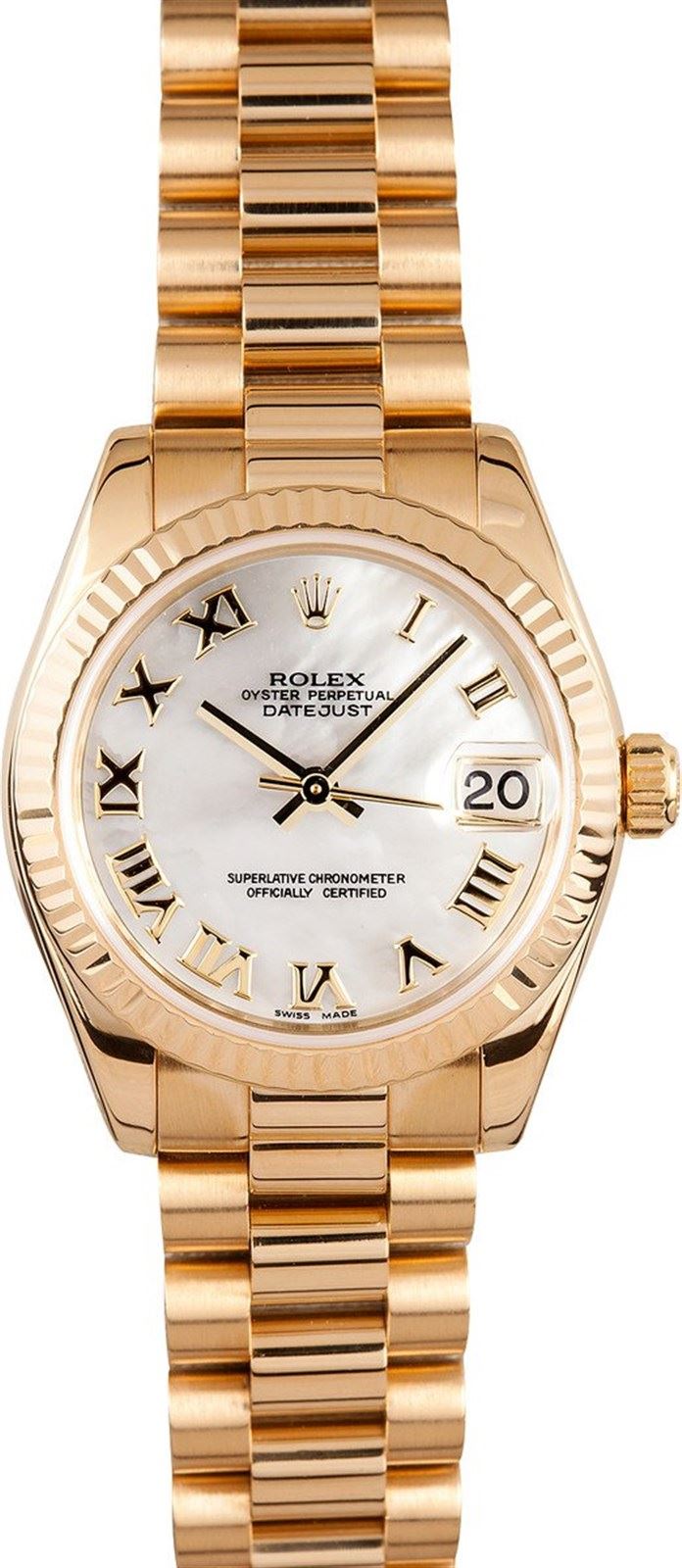 Model/Style-President 178278 Serial/Year-Random Features-Automatic movement w/ date, Quickset, scratch-resistant sapphire crystal, waterproof screw-down crown Case-18k yellow gold w/ fluted bezel, Mid-size 31mm Bracelet-18k yellow gold Presidential #9180