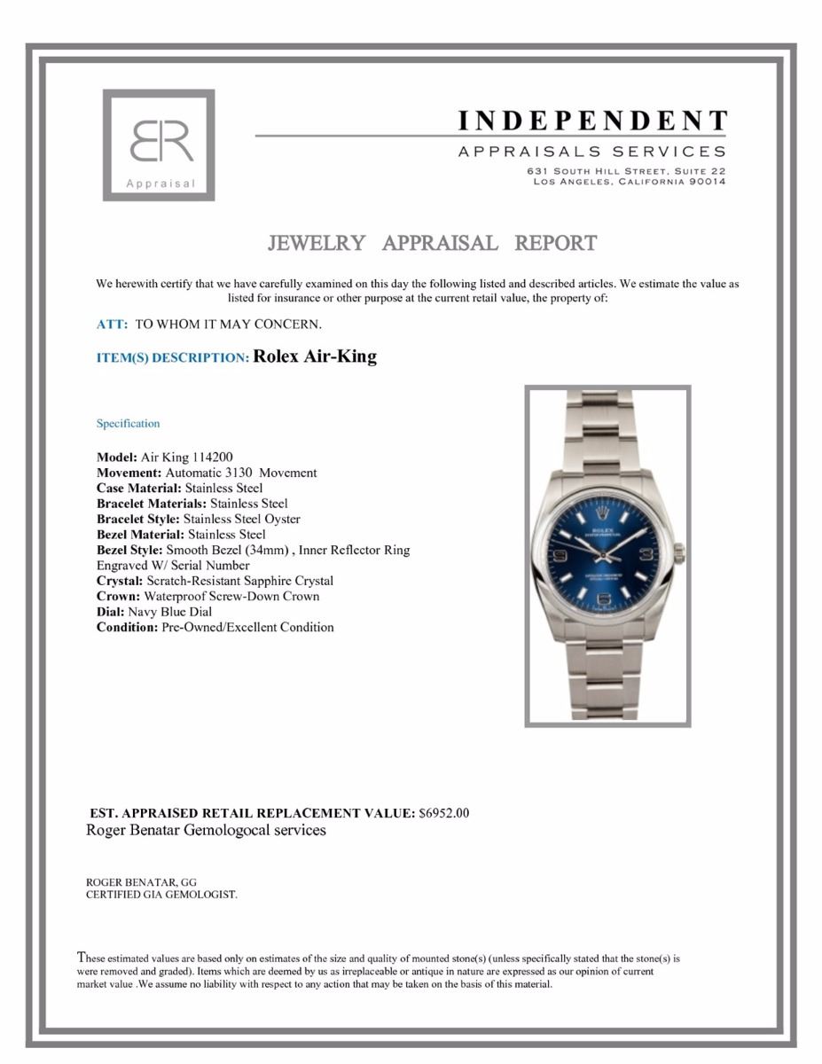 Model/Style-Air King 114200 Serial/Year-Random Features-Automatic 3130 movement, scratch-resistant sapphire crystal, waterproof screw-down crown Case-Stainless steel w/ smooth bezel (34mm), inner reflector ring engraved w/ serial number Bracelet-Stainless steel Oyster #9011