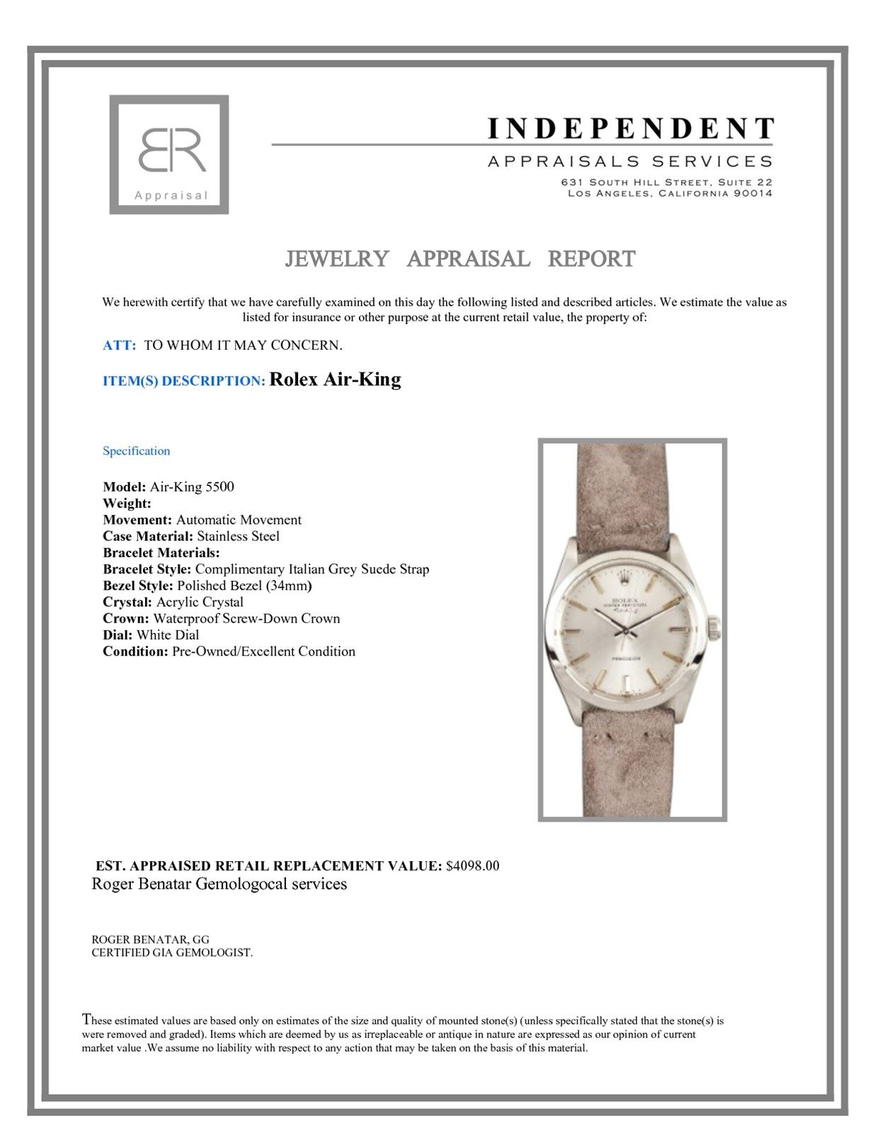 Model/Style-Air-King 5500 Serial/Year-Random Features-Automatic movement, acrylic crystal, waterproof screw-down crown Case-Stainless steel w/ polished bezel (34mm) Bracelet-Complimentary Italian Grey Suede Strap (other strap options available at no cost to customer #9010