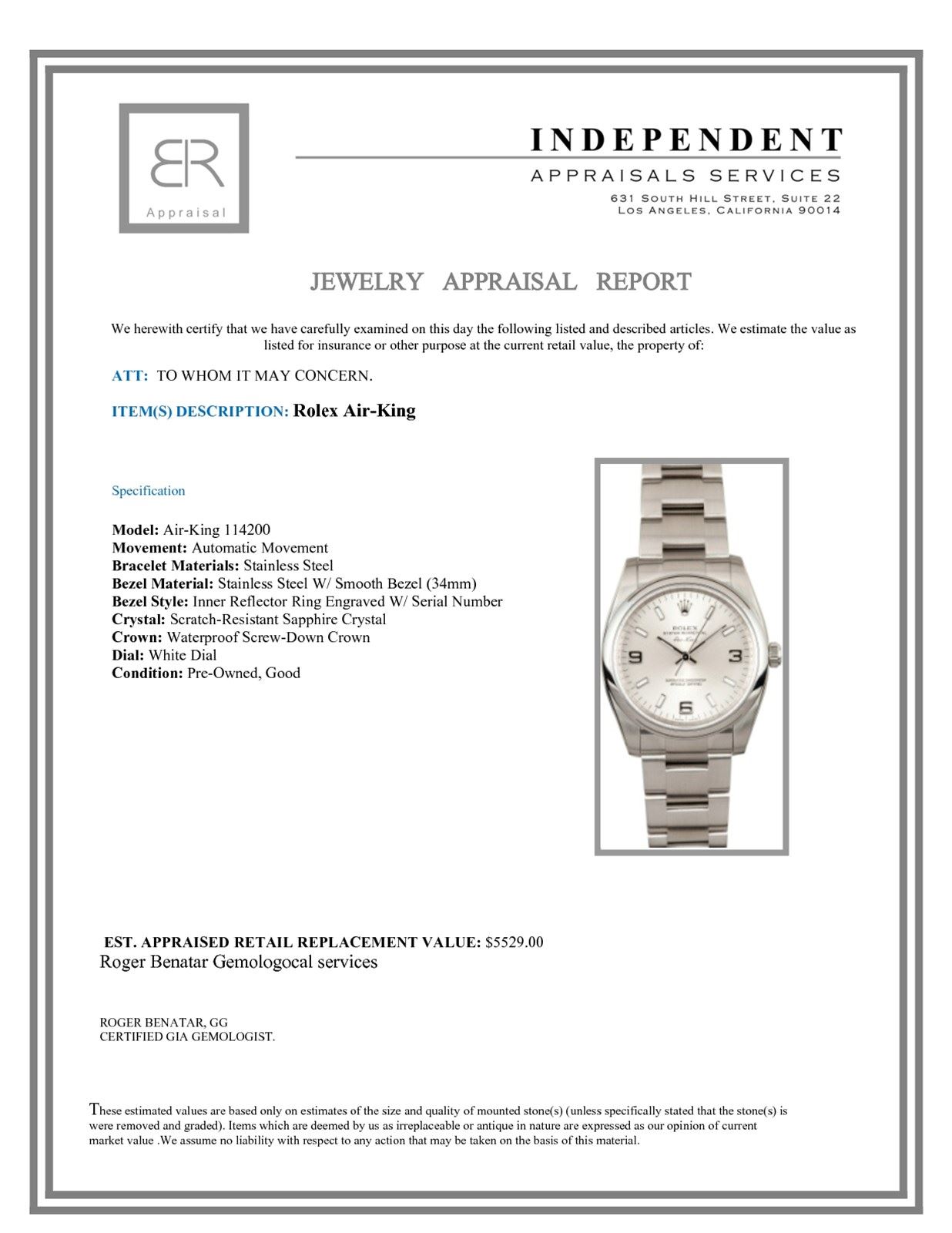 Model/Style-Air-King - 14000 Serial/Year-Random Features-Automatic 3000 movement, 27 jewels, scratch-resistant sapphire crystal, waterproof screw-down crown Case-Stainless steel with smooth bezel (34mm) Bracelet-Stainless steel Oyster #9004