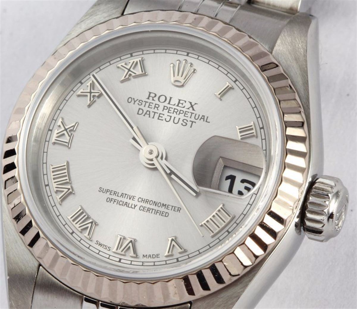 Model/Style-Datejust 79174 Serial/Year-Random Features-Automatic movement w/date, scratch-resistant sapphire crystal, waterproof screw-down crown Case-Stainless steel w/ 18k white gold fluted bezel (26mm) Bracelet-Stainless steel Jubilee #9051