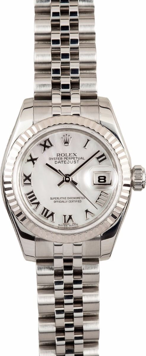 Model/Style-DateJust 179174 Serial/Year-Random Features-Automatic movement w/ date, Quickset, scratch resistant sapphire crystal, inner reflector ring serial engraved Case-Stainless steel w/ 18k white gold fluted bezel (26mm) Bracelet-Stainless steel Jubilee #9046