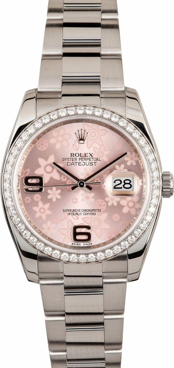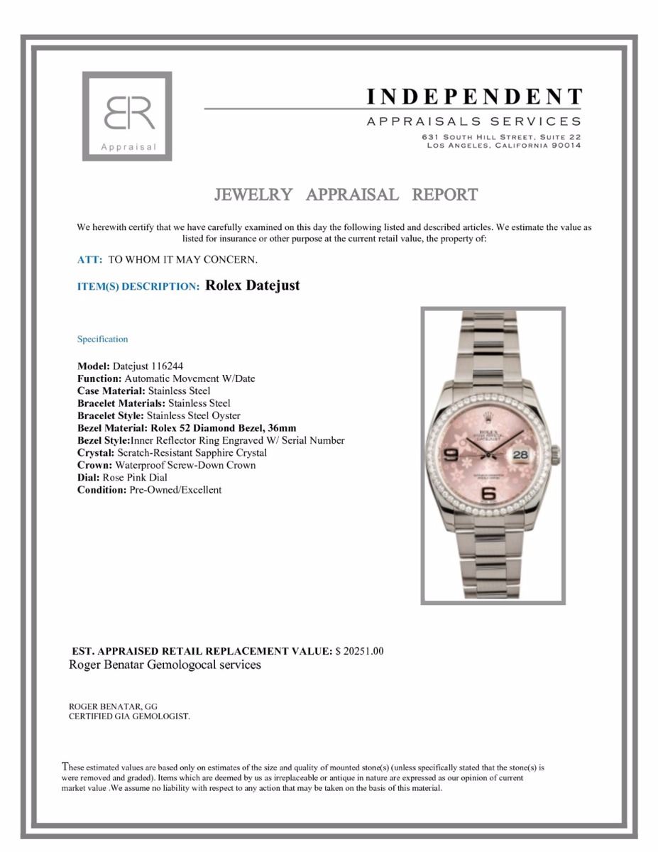Model/Style-Datejust 116244 Serial/Year-Random Features-Automatic movement w/date, scratch-resistant sapphire crystal, waterproof screw-down crown Case-Stainless steel w/ Rolex 52 diamond bezel, 36mm, inner reflector ring engraved w/ serial number Bracelet-Stainless steel Oyster #9027