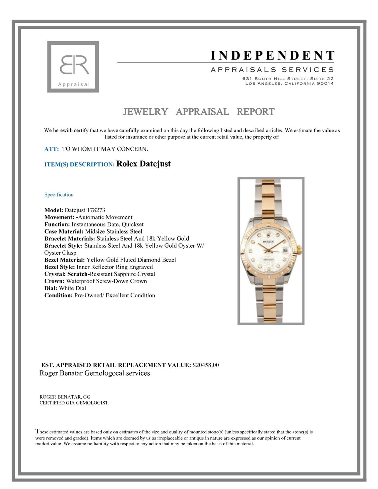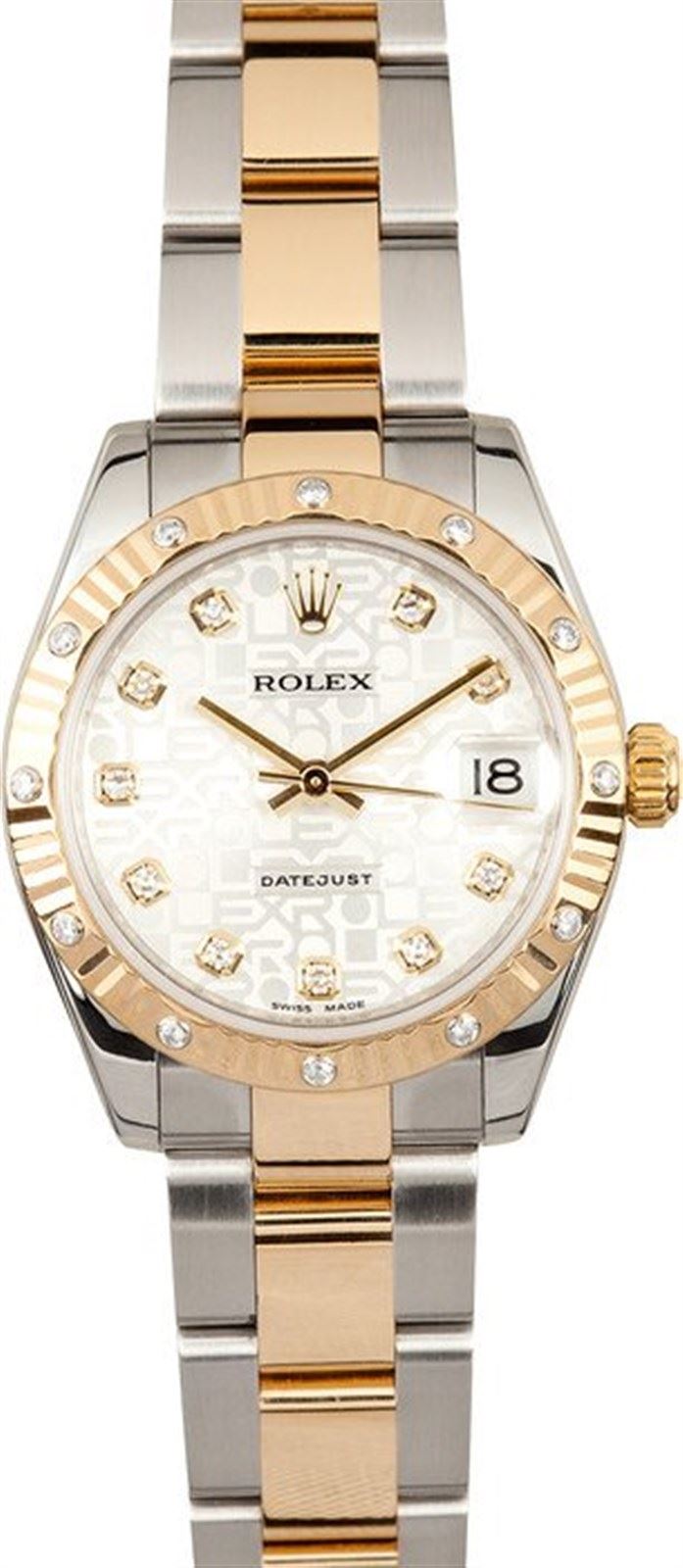 Model/Style-DateJust 178273 Serial/Year-Random Features-Automatic movement w/ date, Quickset, scratch-resistant sapphire crystal, waterproof screw-down crown Case-Midsize Stainless steel w/ yellow gold fluted diamond bezel, inner reflector ring engraved w/ serial number, no holes Bracelet-Stainless steel and 18k yellow gold oyster w/ oyster clasp #9021