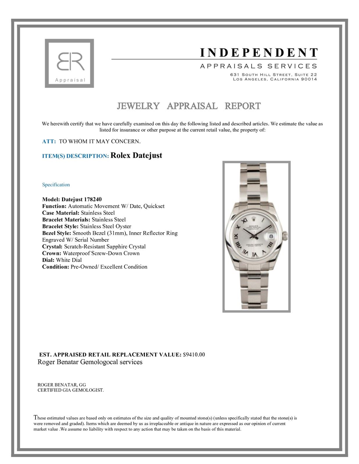 Model/Style-DateJust 178240 Serial/Year-Random Features-Automatic movement w/ date, Quickset, scratch-resistant sapphire crystal, waterproof screw-down crown Case-Stainless steel w/ smooth bezel (31mm), inner reflector ring engraved w/ serial number Bracelet-Stainless steel Oyster #9025
