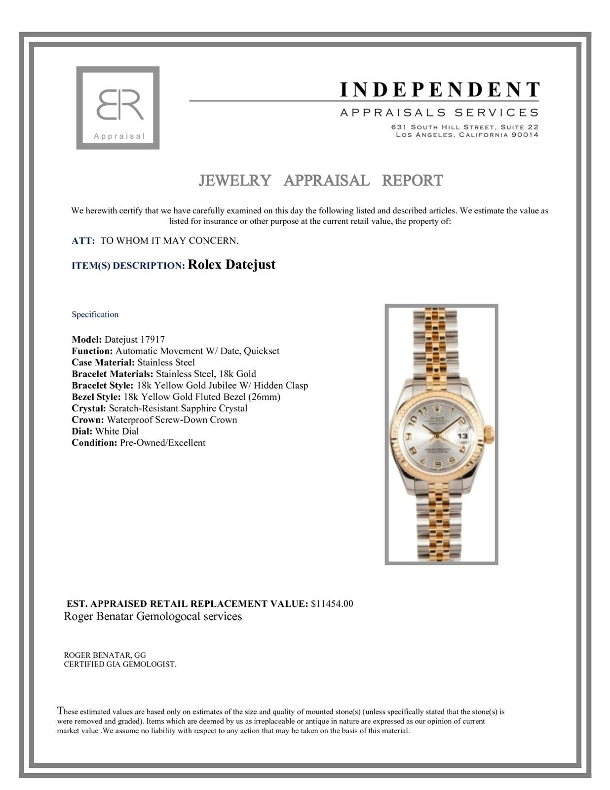 Not all jewelry, watches or loose stones are appraised and the appraisals are provided for bidders only in certain instances at the discretion of the Company. Appraisals, if any should be use to verify gemstone and or metal weights. The appraisals should not be used for valuation of any item. No guarantee, warranty or representation is intended by the Company in any appraisal. All dimensions and weights of such lots are approximate and are consistent with standards and practices in the industry. Condition reports are provided as a service to the prospective buyer. Bidders should take note that such descriptions are not warranties and that watches may need general service, change of battery or further repairs for which the buyer is solely responsible