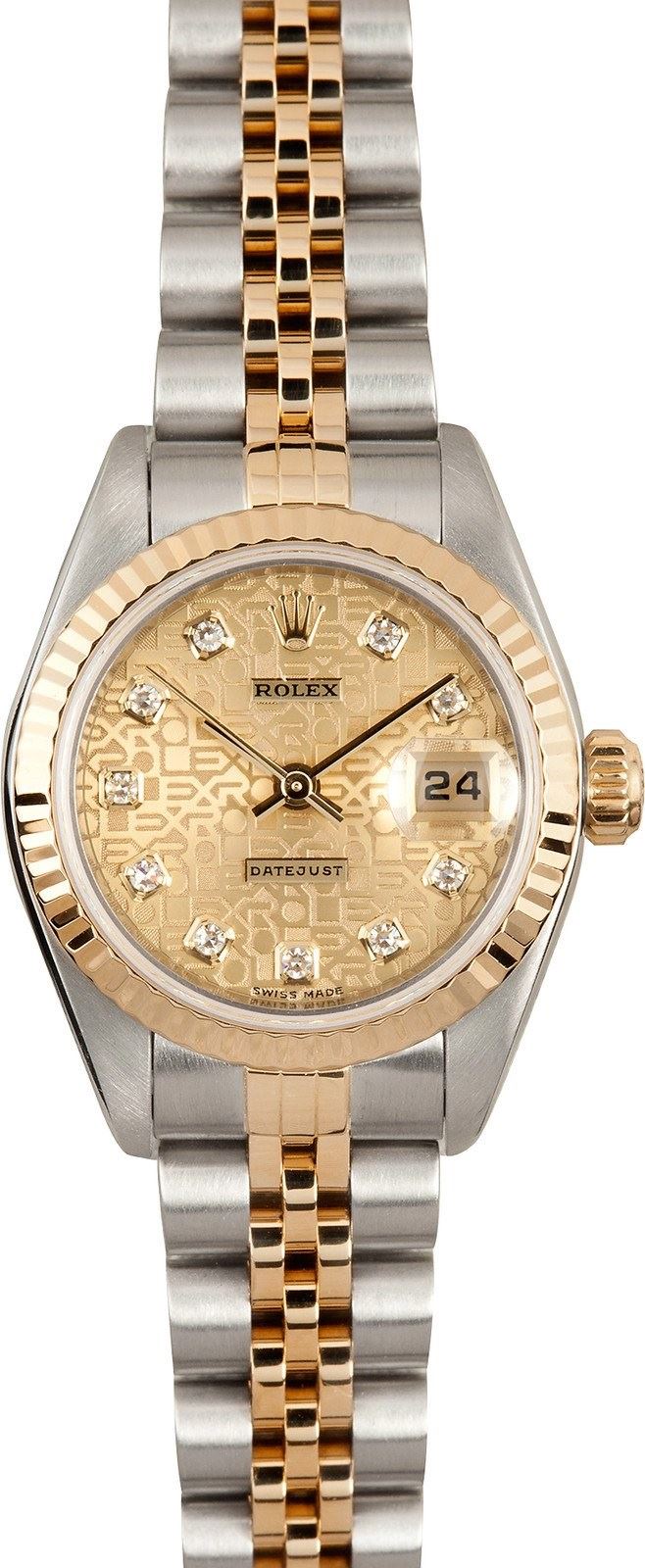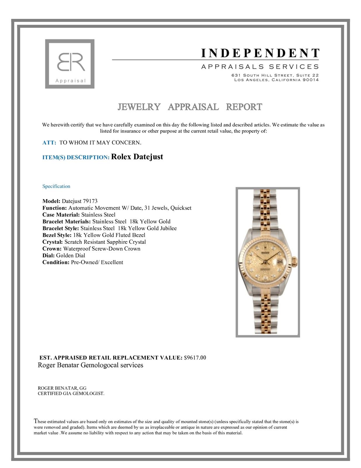 Model/Style-Datejust 79173 Serial/Year-Random Features-Automatic movement w/ date, 31 jewels, Quickset, scratch resistant sapphire crystal, waterproof screw-down crown Case-Stainless steel w/ 18k yellow gold fluted bezel Bracelet-Stainless Steel and 18k yellow gold Jubilee #9038