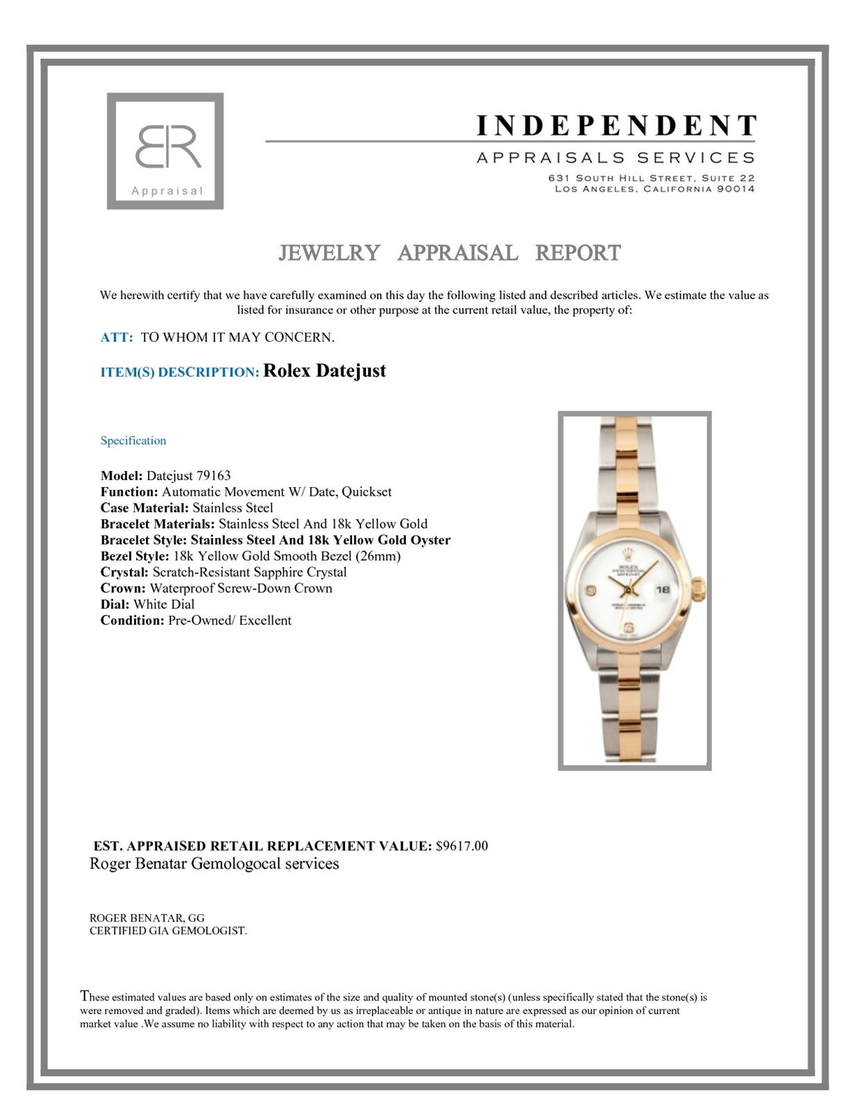 Not all jewelry, watches or loose stones are appraised and the appraisals are provided for bidders only in certain instances at the discretion of the Company. Appraisals, if any should be use to verify gemstone and or metal weights. The appraisals should not be used for valuation of any item. No guarantee, warranty or representation is intended by the Company in any appraisal. All dimensions and weights of such lots are approximate and are consistent with standards and practices in the industry. Condition reports are provided as a service to the prospective buyer. Bidders should take note that such descriptions are not warranties and that watches may need general service, change of battery or further repairs for which the buyer is solely responsible