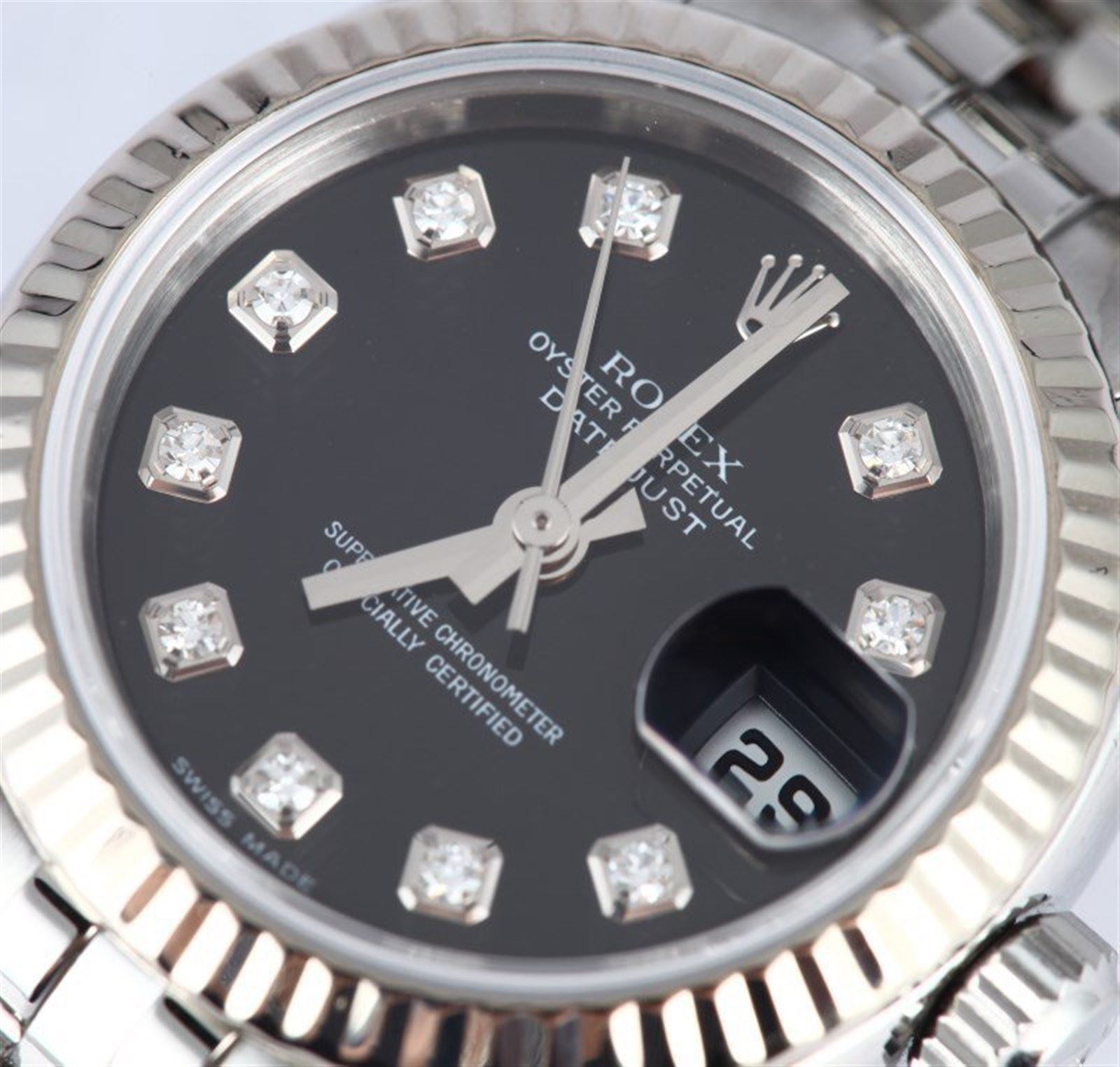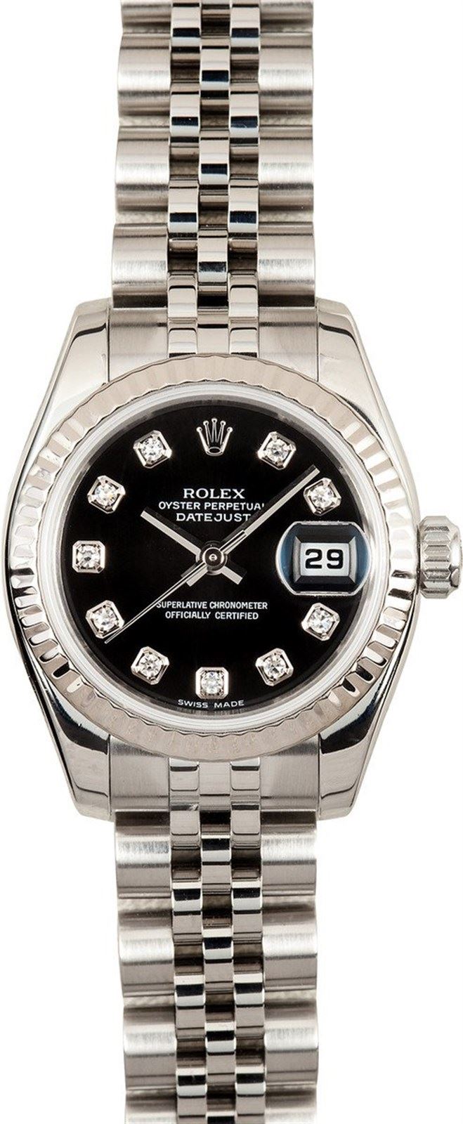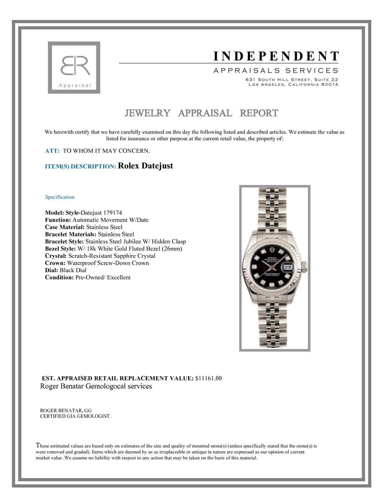 Model/Style-Datejust 179174 Serial/Year-Random Features-Automatic movement w/date, scratch-resistant sapphire crystal, waterproof screw-down crown Case-Stainless steel w/ 18k white gold fluted bezel (26mm) Bracelet-Stainless steel Jubilee w/ hidden clasp #9044
