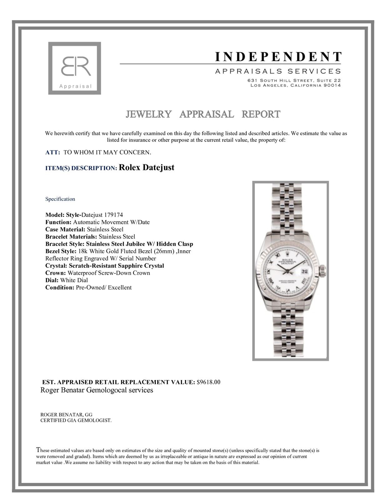 Model/Style-DateJust 179174 Serial/Year-Random Features-Automatic movement w/date, scratch-resistant sapphire crystal, waterproof screw-down crown, inner reflector ring engraved w/ serial number Case-Stainless steel w/ 18k white gold fluted bezel (26mm) Bracelet-Stainless steel Jubilee w/ hidden clasp #9047