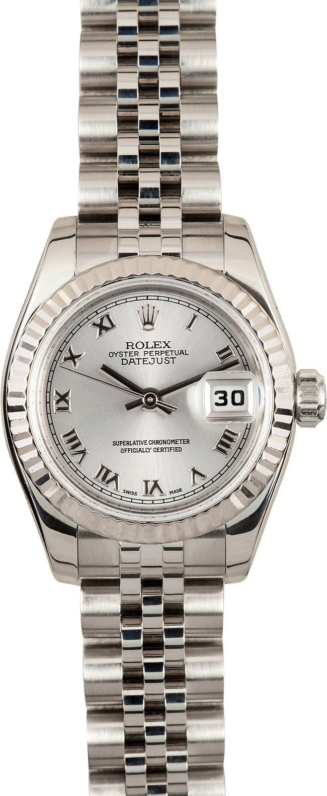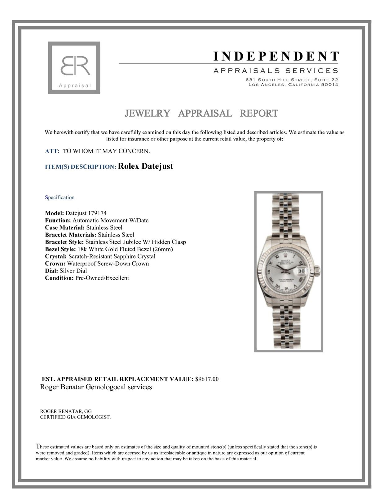 Model/Style-DateJust 179174 Serial/Year-Random Features-Automatic movement w/date, scratch-resistant sapphire crystal, waterproof screw-down crown Case-Stainless steel w/ 18k white gold fluted bezel (26mm) Bracelet-Stainless steel Jubilee w/ hidden clasp #9048