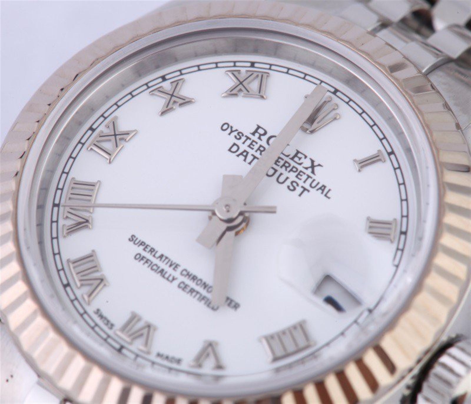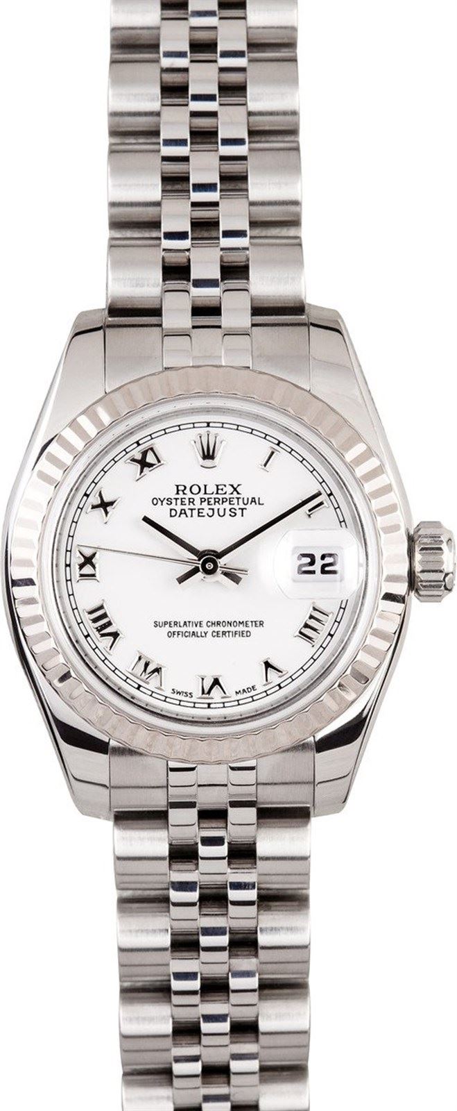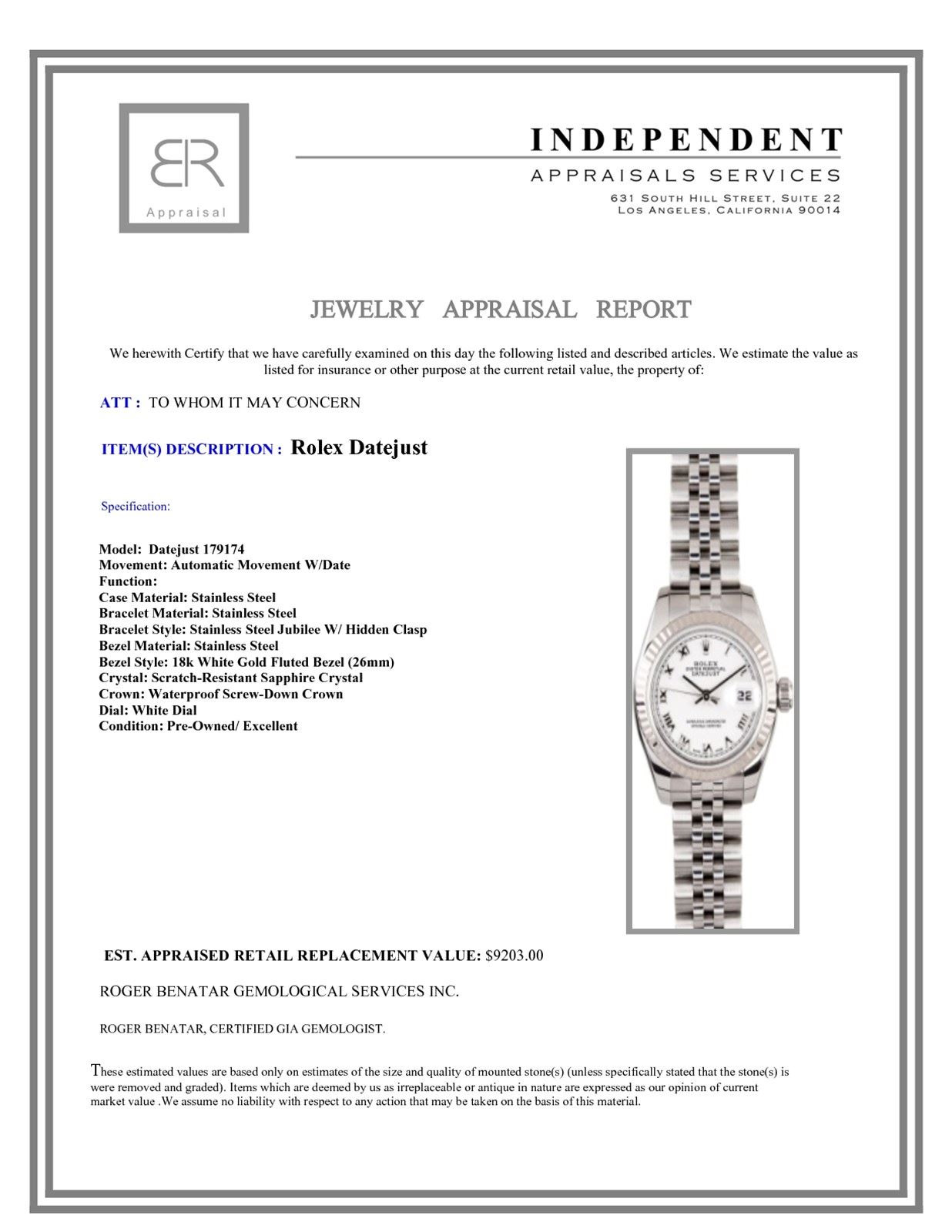 Model/Style-DateJust 179174 Serial/Year-Random Features-Automatic movement w/date, scratch-resistant sapphire crystal, waterproof screw-down crown Case-Stainless steel w/ 18k white gold fluted bezel (26mm) Bracelet-Stainless steel Jubilee w/ hidden clasp #9049