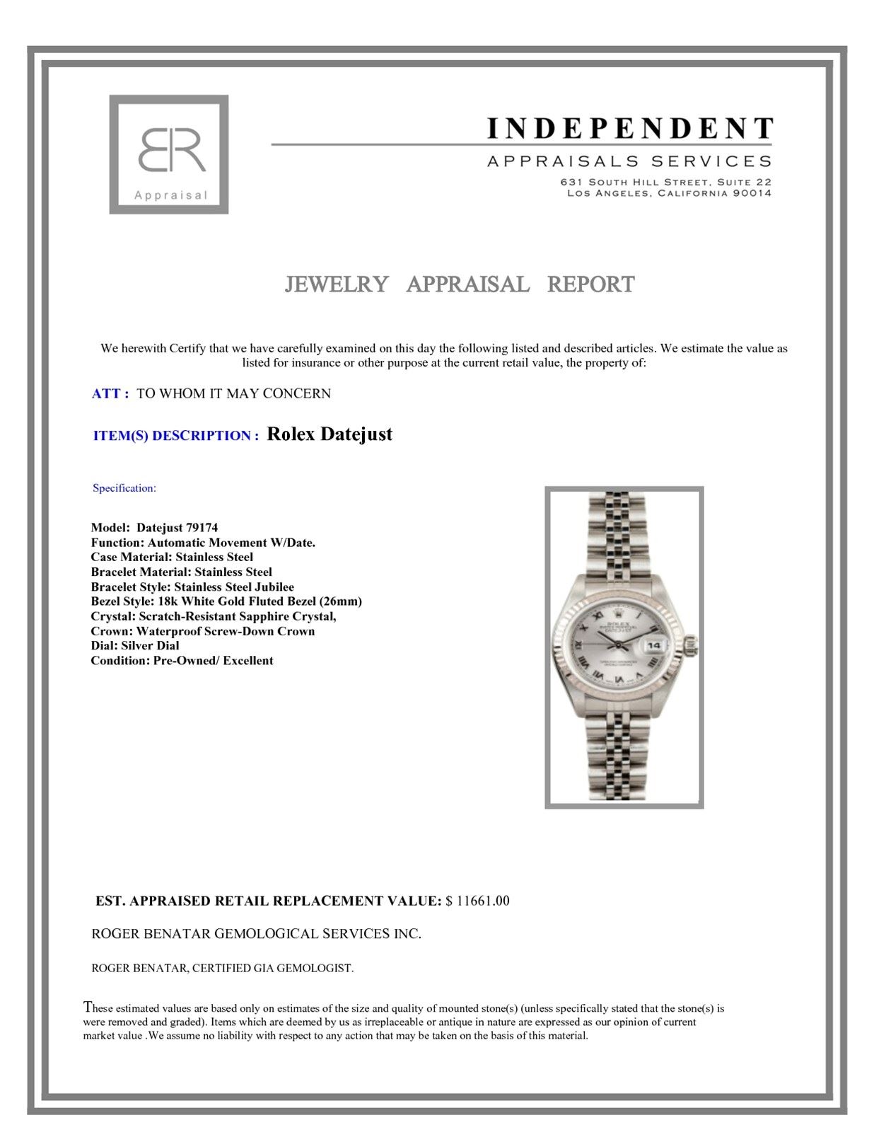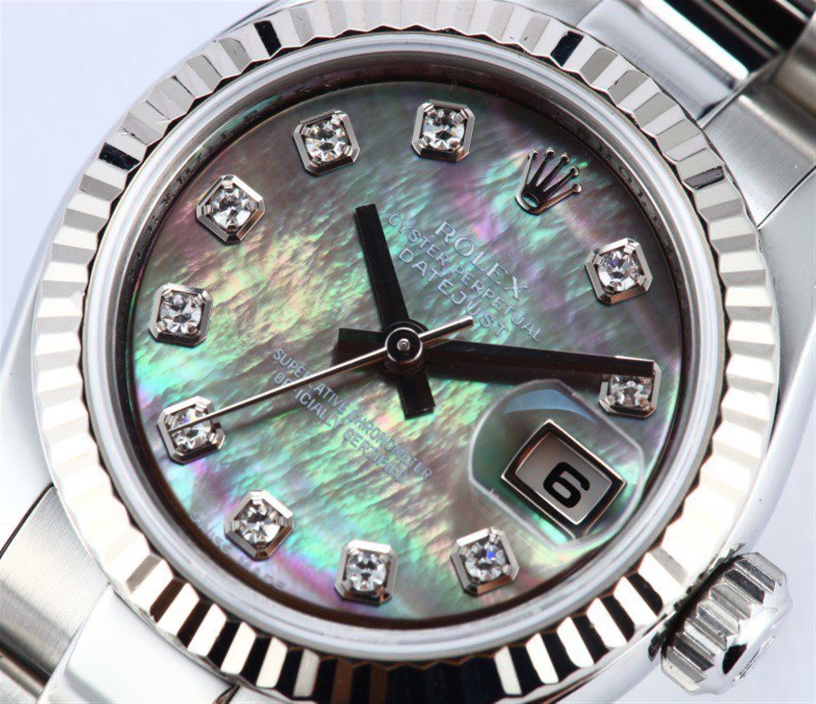 Model/Style-Datejust 179174 Serial/Year-Random Features-Automatic movement w/date, scratch-resistant sapphire crystal, waterproof screw-down crown Case-Stainless steel w/ 18k white gold fluted bezel (26mm) Bracelet-Stainless steel Oyster #9052