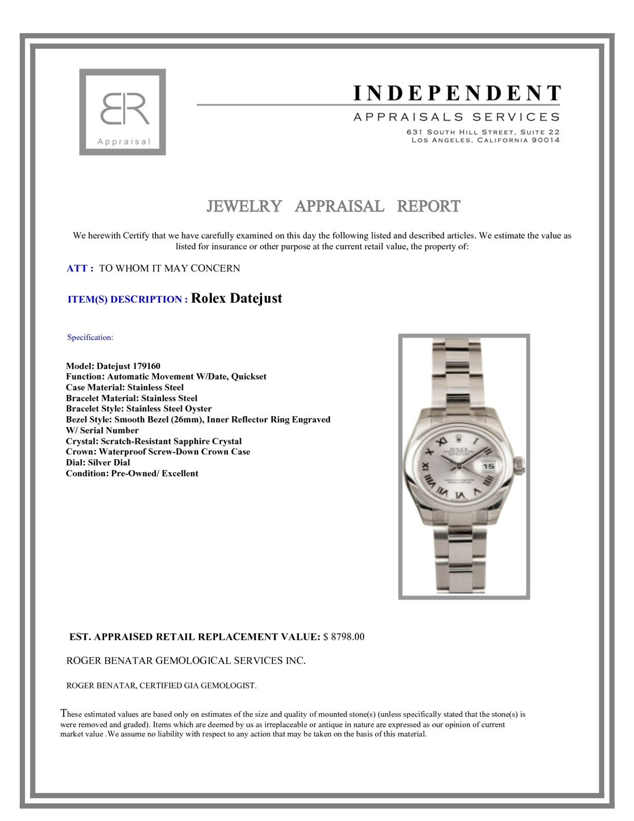 Model/Style-DateJust 179160 Serial/Year-Random Features-Automatic movement w/date, Quickset, scratch-resistant sapphire crystal, waterproof screw-down crown Case-Stainless steel w/ smooth bezel (26mm), inner reflector ring engraved w/ serial number Bracelet-Stainless steel Oyster #9053
