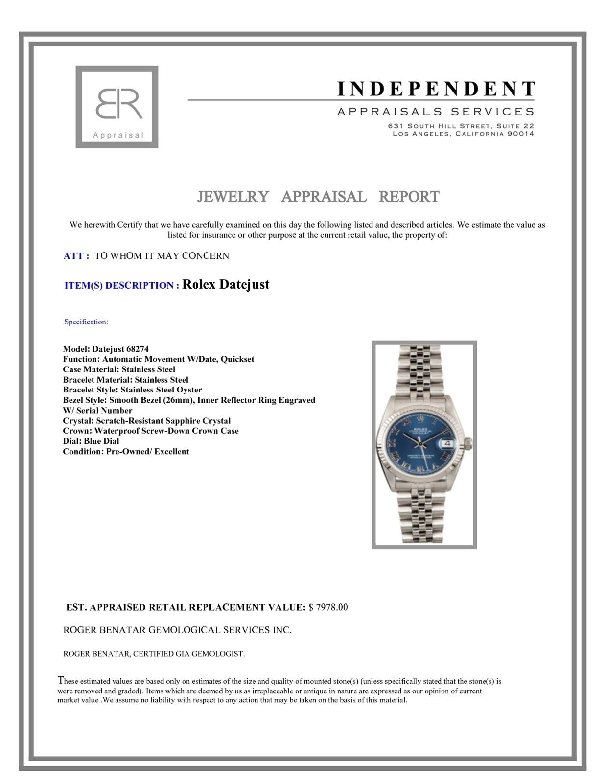 Model/Style-Datejust 68274 Serial/Year-Random Features-Automatic movement w/date, scratch-resistant sapphire crystal, waterproof screw-down crown Case-Stainless steel w/ 18k white gold fluted bezel Bracelet-Stainless steel Jubilee #9055