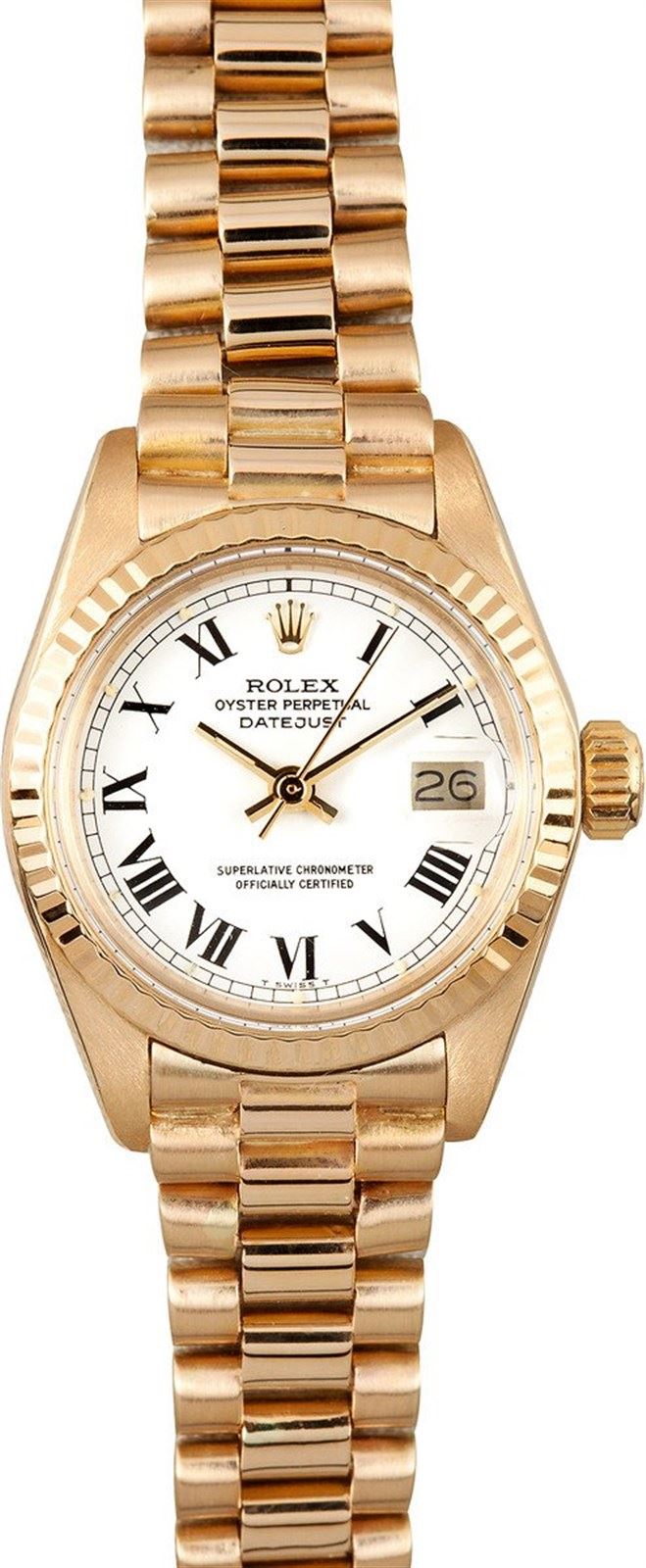 Model/Style-Datejust 6917 Serial/Year-Random Features-Automatic movement w/ date, Quickset date, acrylic crystal, waterproof screw-down crown Case-18k yellow gold (26mm) w/ fluted bezel Bracelet-18K yellow gold President #9062