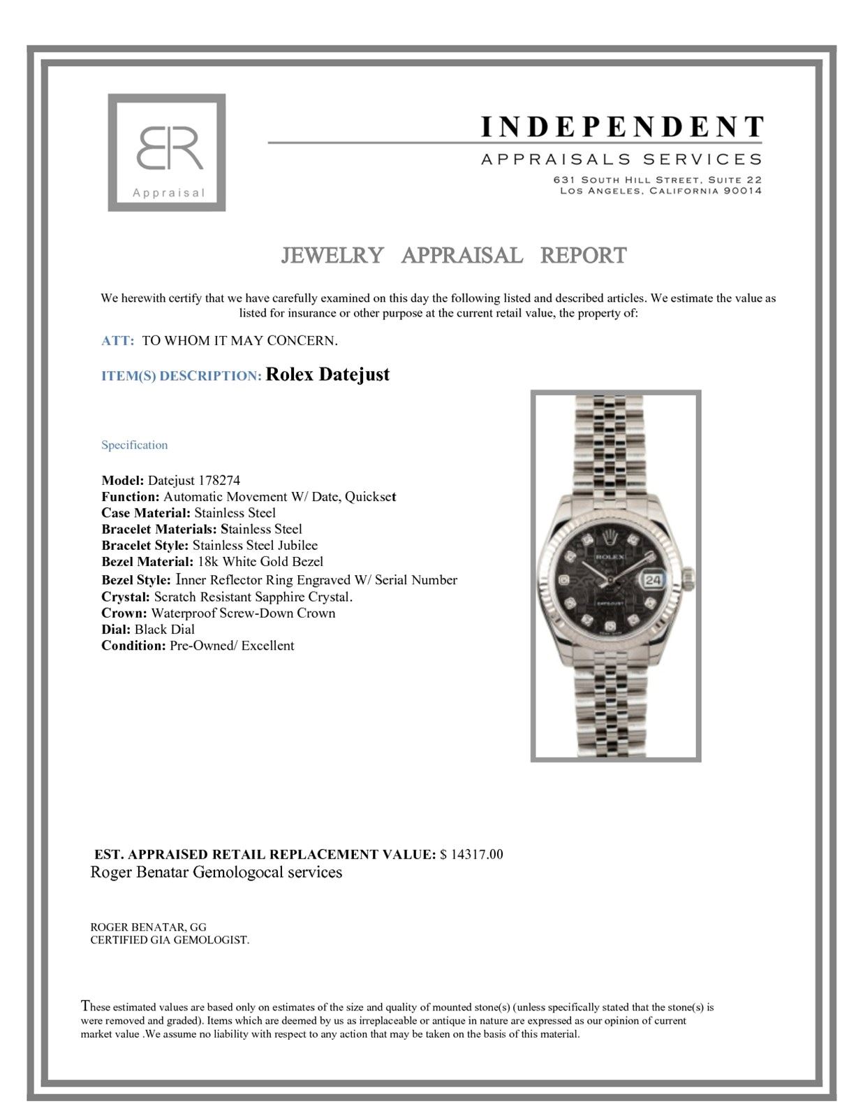 Model/Style-Datejust 178274 Serial/Year-Random Features-Automatic movement w/ date, Quickset, scratch resistant sapphire crystal, waterproof screw-down crown, inner reflector ring engraved w/ serial number Case-Stainless steel w/ 18k white gold bezel Bracelet-Stainless steel Jubilee #9032